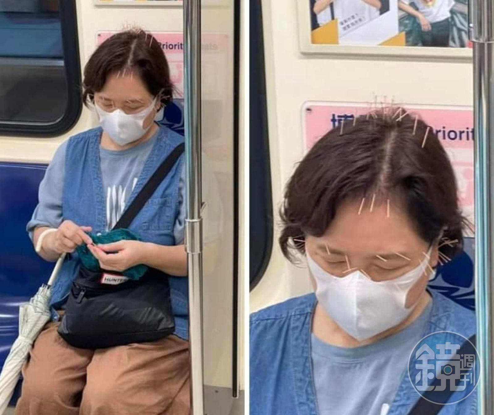 網友在臉書分享,一名身穿藍色背心的婦人在捷運上織毛線的同時,臉上和頭頂上卻扎滿數十根針,畫面有些驚人,有如電影《養鬼吃人》的針頭人造型。網友發文還笑說:「阿姨有練過,還可以織毛衣,時間充分利用」。