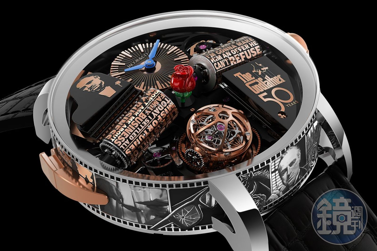 而今年發表的《教父》50週年紀念版,則在視覺上做了更震撼的演出。首先,其白K金錶殼的側邊成為電影的膠卷,以雷射雕刻技法雕出電影中的13個經典場面(包括那令人震撼萬分的馬頭)。這些雷射雕刻來自JACOB & CO的瑞士合作夥伴之一DM Surfaces,以奈米雷射與飛秒雷射技術,做出非常逼真的3D明暗對比雕刻,再現電影的圖像,每個錶殼的製作工時超過30小時。