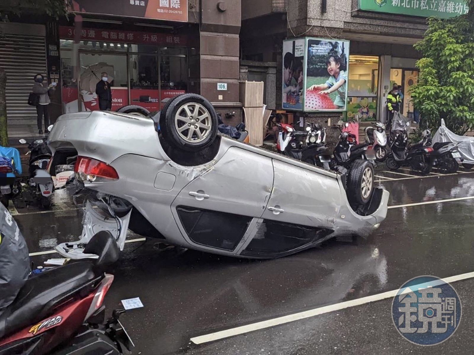 一部轎車因與撞上車門的車輛發生碰撞,導致翻車橫躺路邊。(翻攝畫面)發布時間:2022.11.04 14:14 臺北時間