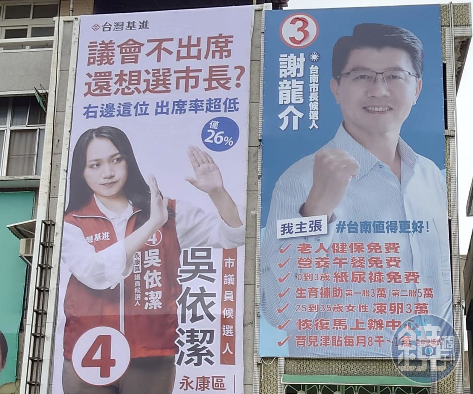 謝龍介在大灣廣護宮旁的看板寫著滿滿的政見,包括老人健保免費、營養午餐免費、生育補助及育兒津貼等。至於吳依潔則是在謝龍介的看板左邊旁懸掛看板,大酸右邊這位「議會不出席,還想選市長?」並指出謝僅有26%的超低出席率。