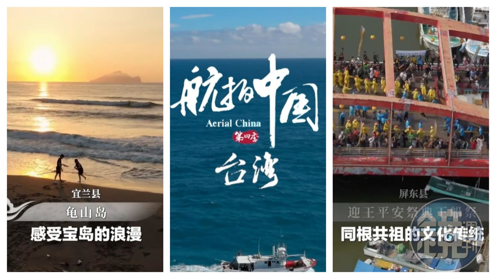 中國官媒《央視》近期公開《航拍中國》第四季的預告片,當中包含「俯瞰台灣」篇章,預告內容出現屏東鵝鑾鼻、中央山脈、台北101大樓、澎湖馬公港、宜蘭龜山島、大屯火山群、台東樟原海岸、南投日月潭、媽祖遶境、屏東王船祭等畫面。央視新聞微博稱,「台灣篇裡寫成一首首凝固的詩,變成兩岸心靈的一個個『掛鈎』,構築起強大的中華文化認同」。