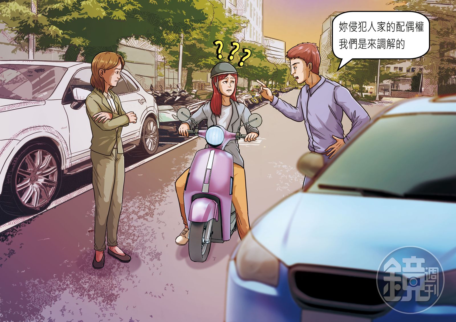 不過,這對男女一搭一唱,說小芳被控妨害家庭,他們受託前來調解,接著把她帶到附近一家超商談判。入座後,女子拿出一張裸照質問她:「這是妳拍給對方觀賞的?對吧!妳的行為已經侵犯對方太太的配偶權,現在《刑法》通姦罪雖然已經廢除,但夏辰月的太太可以告妳侵犯她的配偶權,並且依《民法》請求精神撫慰金!」