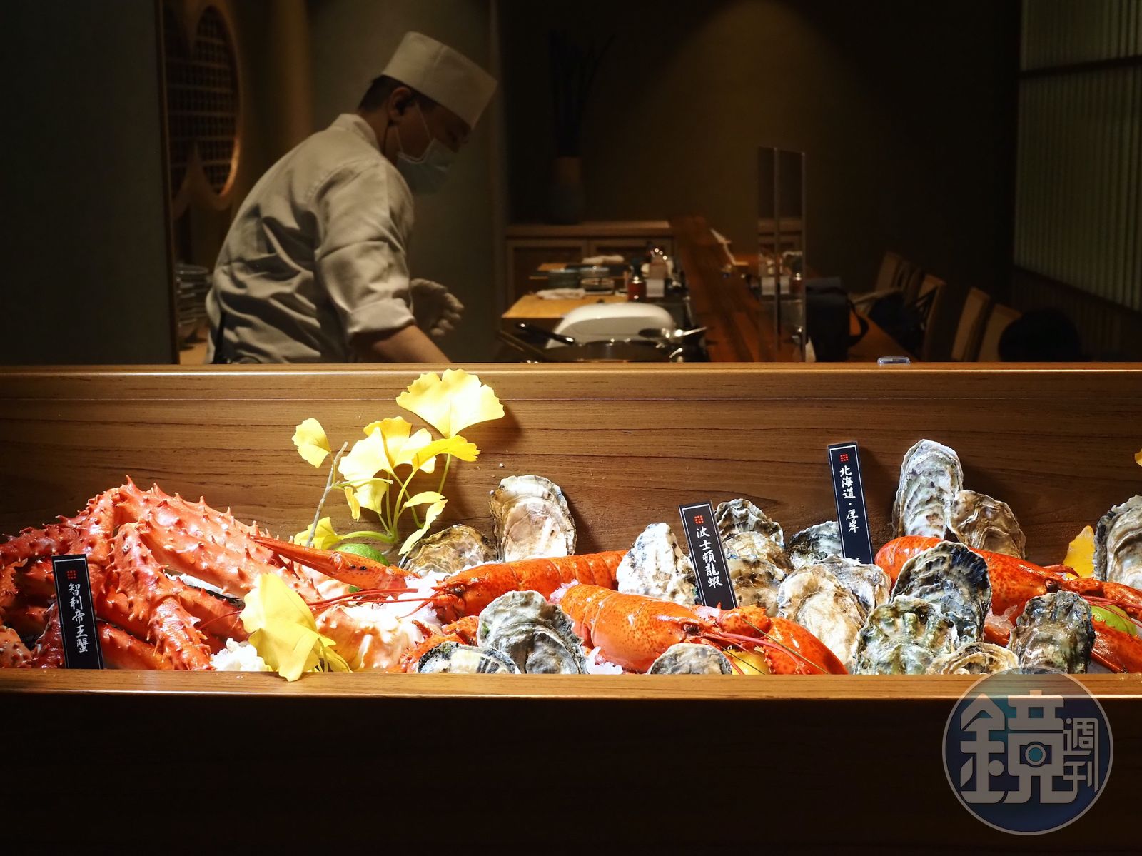 店面雖開在台北SOGO復興館地下二樓的美食街,卻承襲本店由日本空間設計師安原三郎打造的日式侘寂美,用日式障子拉出兼具隱私和優雅的結界,室內則用原木、石材、和紙堆疊出舒心感。但走進店內先映入眼簾的,卻是來自日本、法國等產地的生猛海鮮吧。