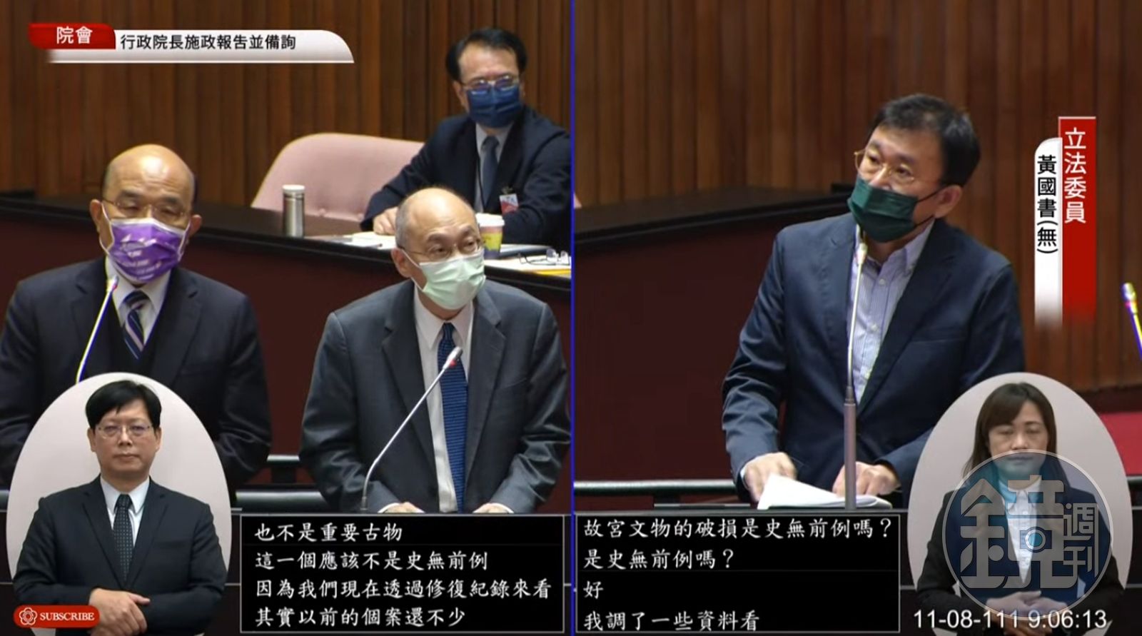 蘇貞昌今與各部會首長前往立法院進行施政報告並備詢,無黨籍立委黃國書質詢時邀請故宮院長吳密察上台一同接受質詢。黃國書先是針對日前傳出破損的3件故宮文物提問,指出依照《文資法》規定目前故宮有哪些典藏物被列為國寶、3件破損文物的文資身分為何?吳密察答道,目前故宮收藏的國寶約570件,而3件文物非屬國寶和重要古物的類別,而是一般文物。