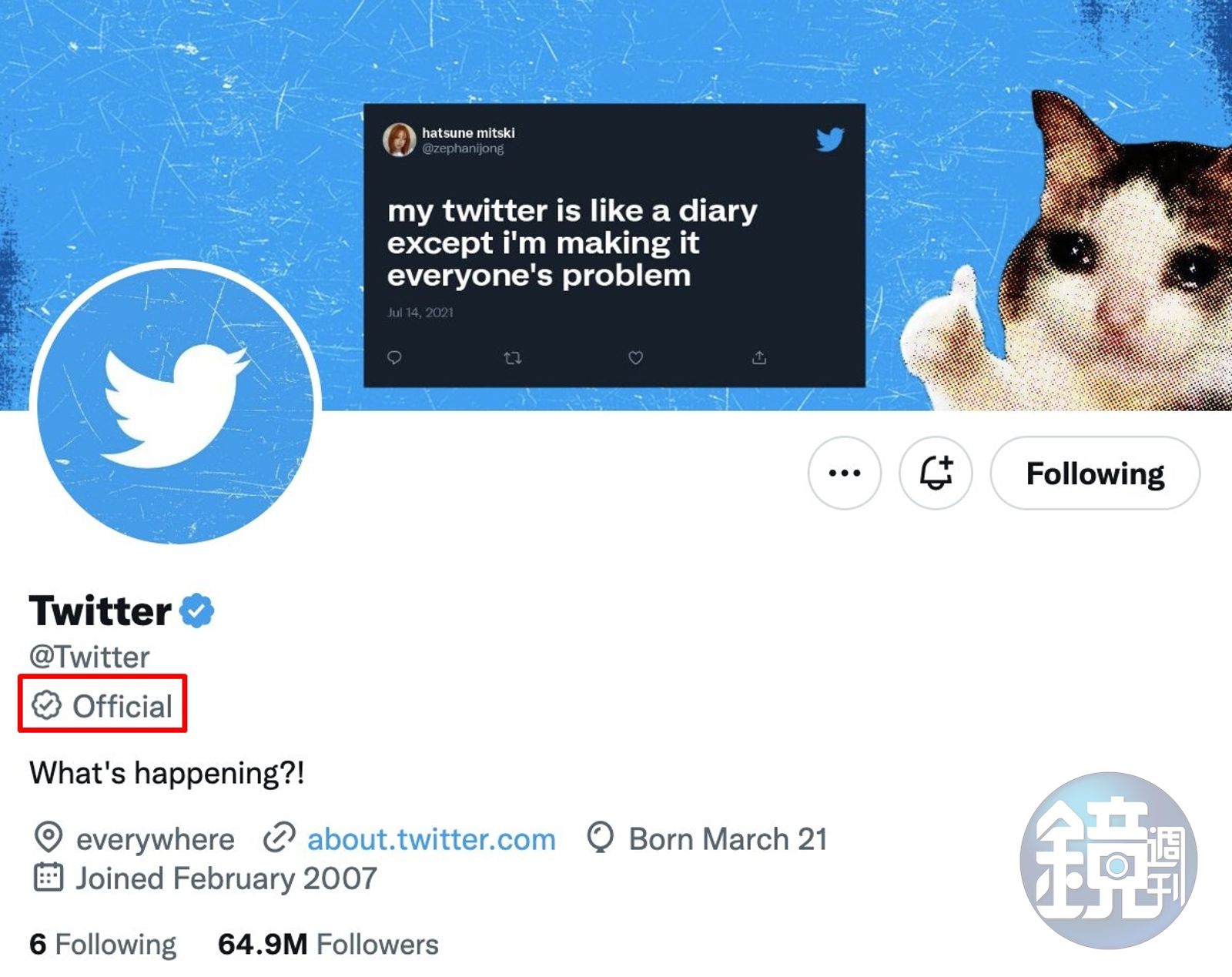 從克勞馥PO出的截圖可見,Twitter官方帳號的右邊除了有傳統的「藍勾勾」,在帳號「@Twitter」的下方,還有一行文字寫著「官方(Official)」並且前方有個灰色勾勾。