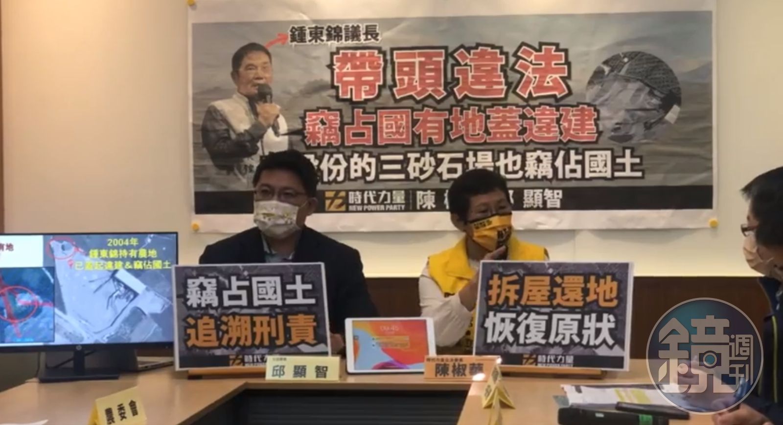 然而相關爭議還沒完,時代力量立委邱顯智、陳椒華今也開記者會,踢爆鍾東錦竊占國土及在農地和國有地上蓋違建。