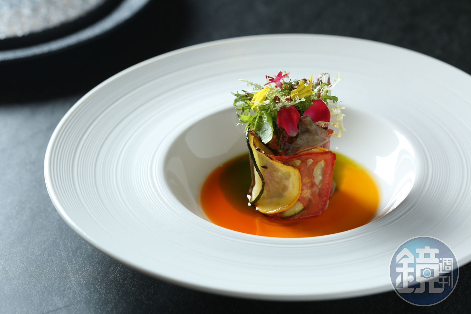 de nuit是法文「夜晚」的意思,整體的空間氛圍低調優雅,菜色也是由經典菜出發。肌肉壯碩的邱彥凱,下手卻十分細膩婉約,好比法式燉菜Ratatouille,邱彥凱以「小花園」為概念設計,讓原本躺平的茄子、櫛瓜和番茄立起來,就像繽紛的花束一般,底下綴以番茄、紅蘿蔔與羅勒提煉出的三色油作為調味,也是配色,一上桌就吸睛。