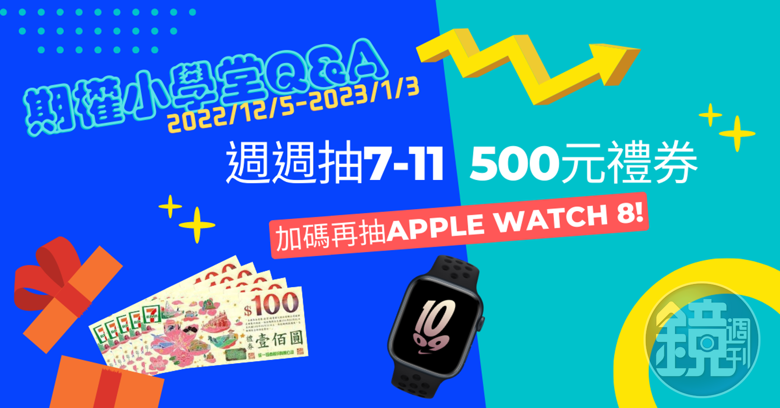 週週參加、週週可抽7-11 500元禮券!最終大獎加碼抽Apple Watch 8!活動將分別於2022/12/12、2022/12/19、2022/12/26、2023/01/04由系統隨機抽出當週得獎者,並公佈得獎名單於1/4鏡週刊FB粉絲專頁,加碼2只Apple Watch 8大獎於2023/01/04同步抽出並公告!