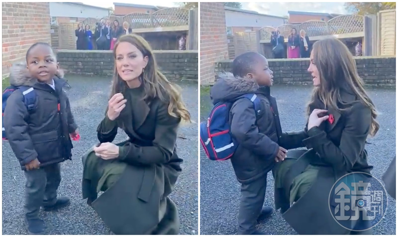 凱特王妃在兒童中心外頭遇到一名叫阿金(Akeem)的3歲小男孩,蹲下身來與他聊天。阿金童言童語問:「妳叫什麼名字?」凱特王妃指著自己說:「我的名字叫凱薩琳。」阿金說:「好唷!」看得旁人覺得超暖心。
