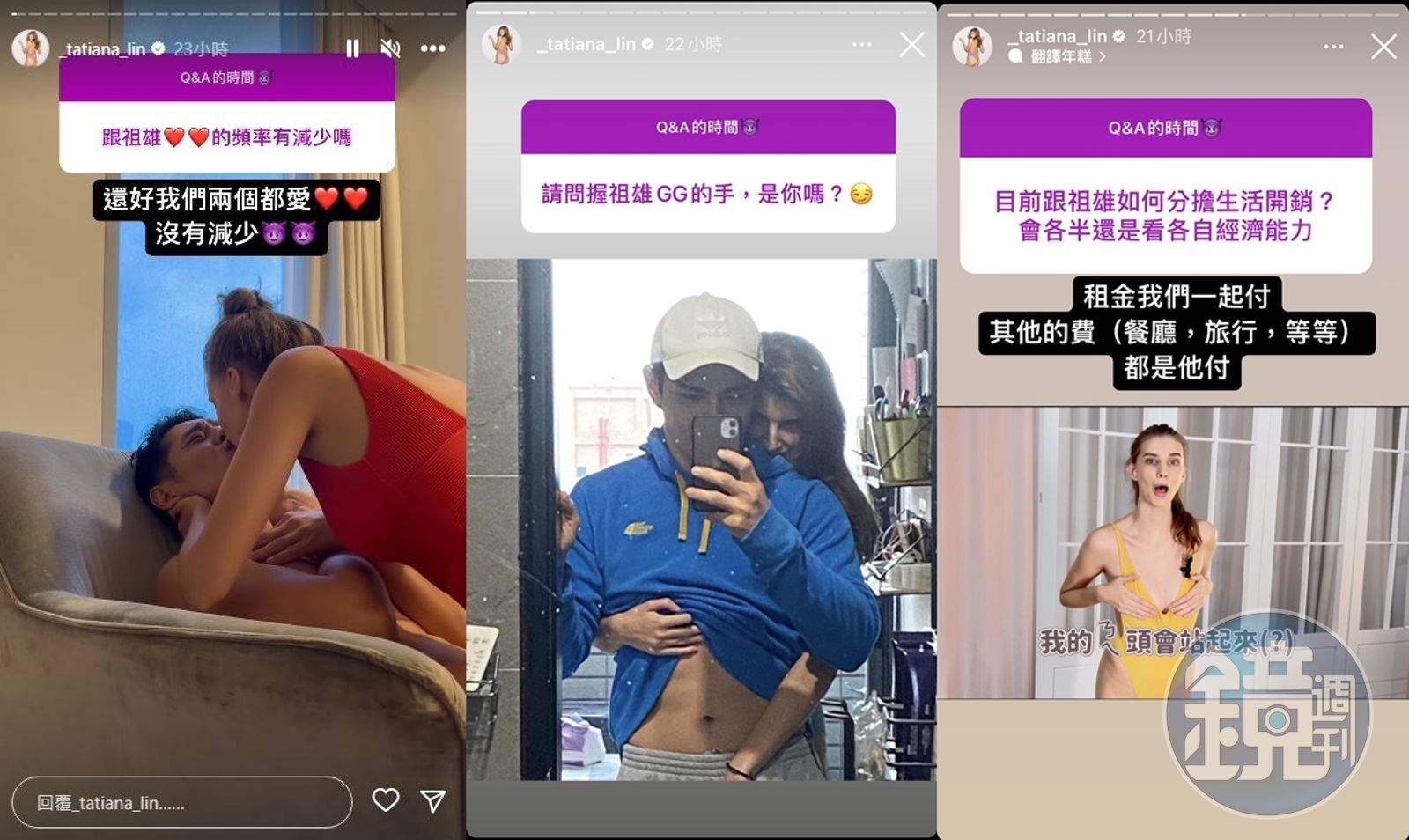 網友另外直接問佳娜是否接受3P性愛?她則坦言跟祖雄都無法;另外佳娜避孕會讓祖雄用保險套,自己不贊成吃藥,至於生活開銷問題,她則說房租一起分擔但其他旅費則是男方出等,不吝公開交往點點滴滴。