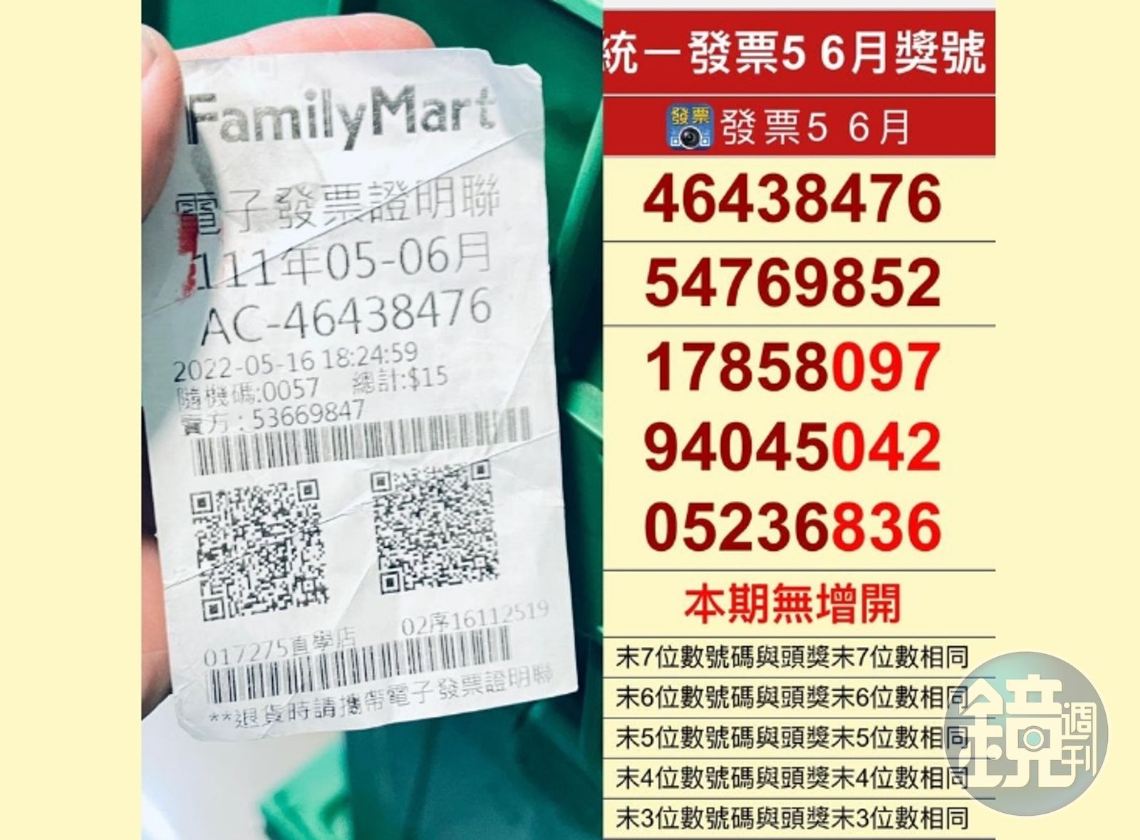 一名網友昨天在臉書曬出一張5月份在超商購物15元的發票,和111年統一發票5、6月獎號,其中一個號碼為「46438476」,與網友手上的發票號碼完全相同。