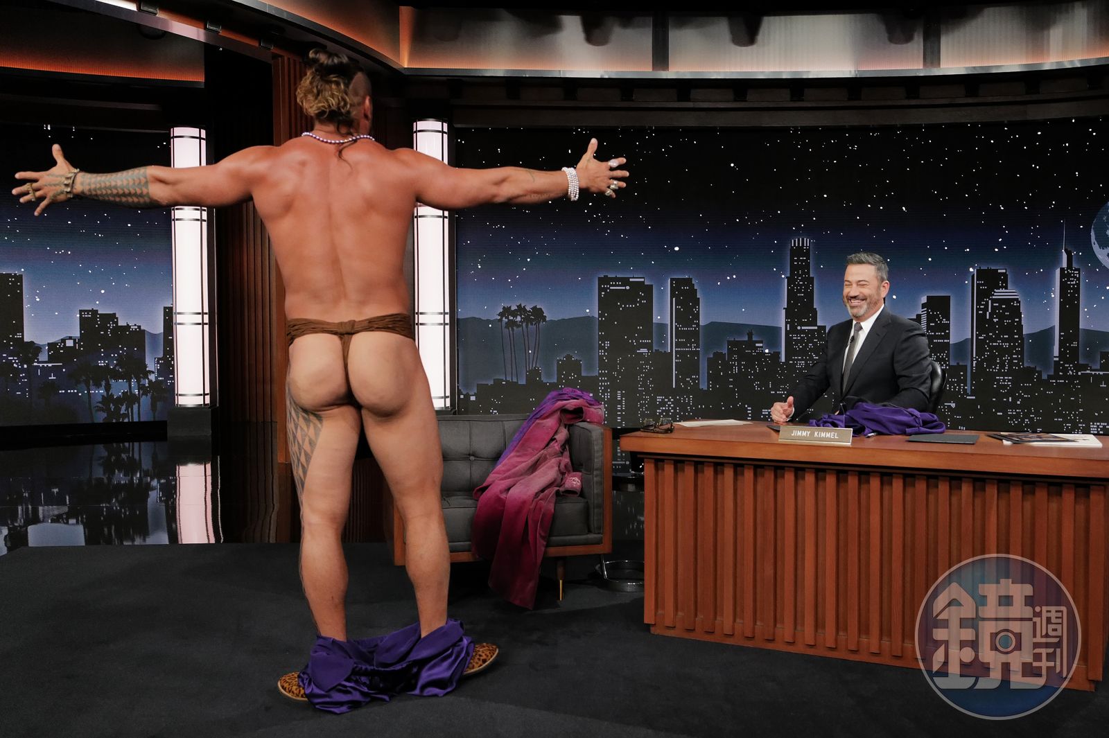 結果主持人吉米金墨就反問,該不會今天你也穿著來錄影了嗎?被這樣一問,傑森摩莫亞直接站起來把衣服脫了,秀出他穿著Malo的身材,還轉身面對攝影機,讓大家看看他的臀部。