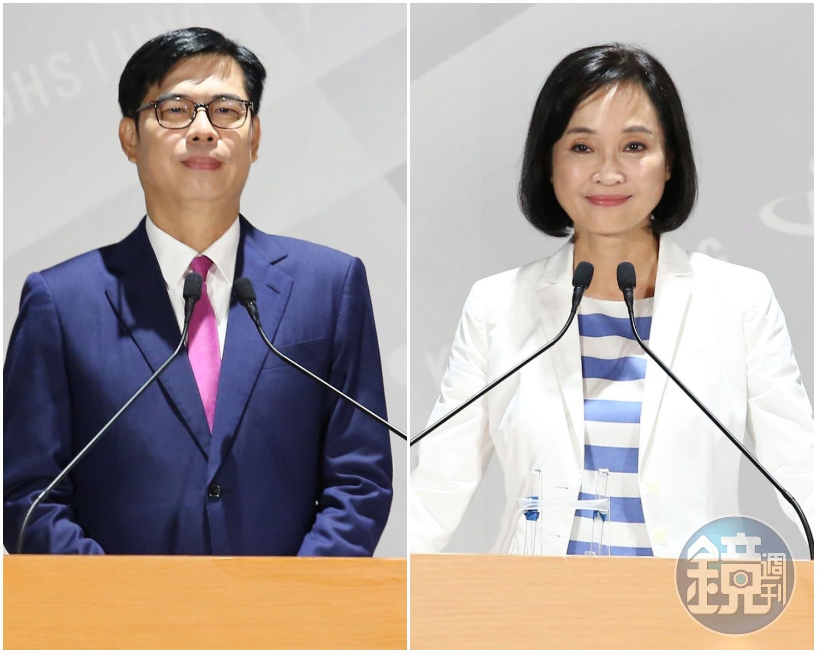 柯志恩(右)在政見申論時,就點出高雄人口流失問題,陳其邁(左)後來回應是「少子化的結果」。(高雄市選委會提供)發布時間:2022.11.12 15:39 臺北時間