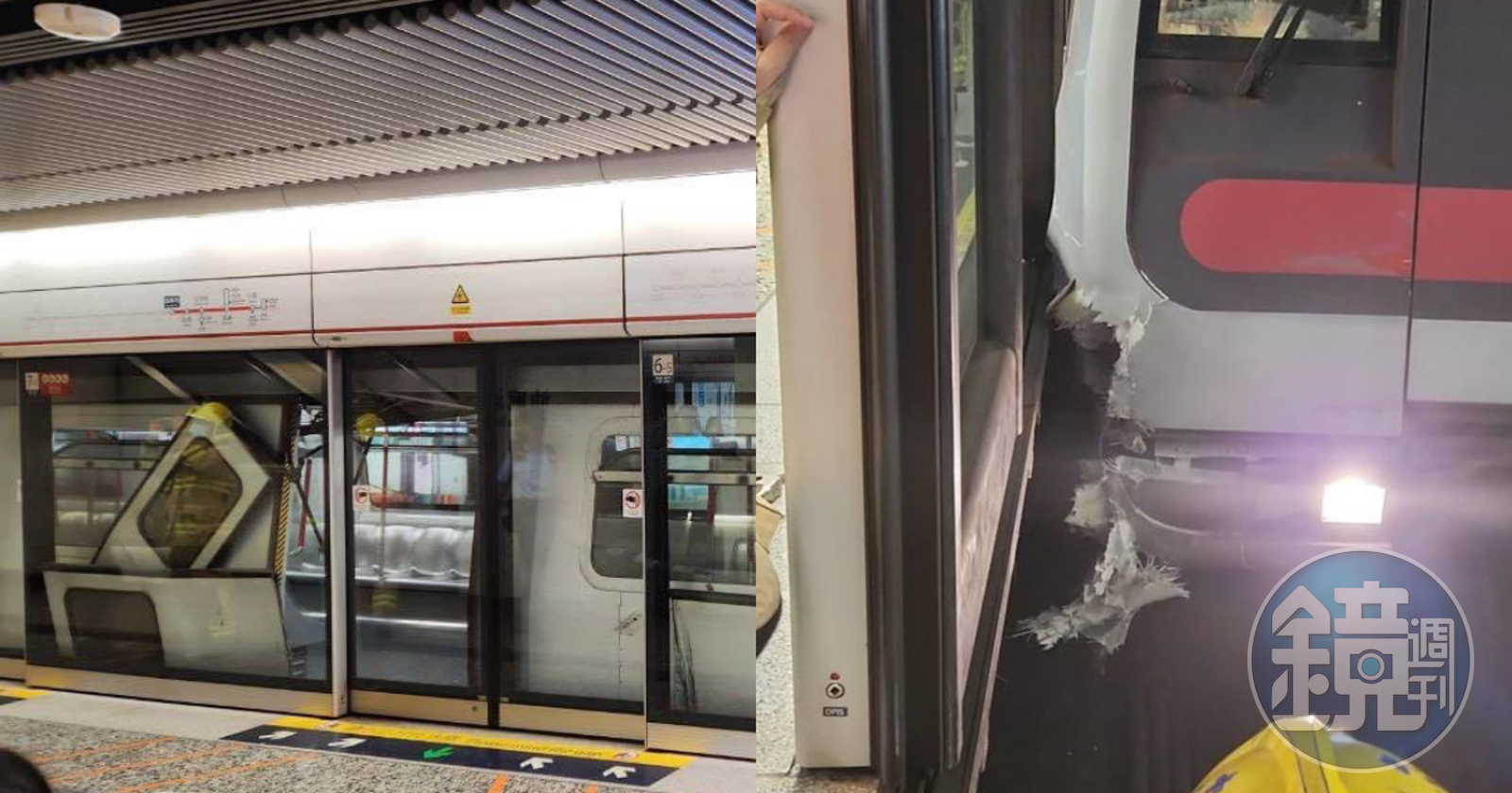 據悉,事故列車當時正要進站,右邊車頭撞上月台一度冒煙,推特上流傳的照片也可以看到,列車的右邊車頭毀損、至少有4道門脫離。