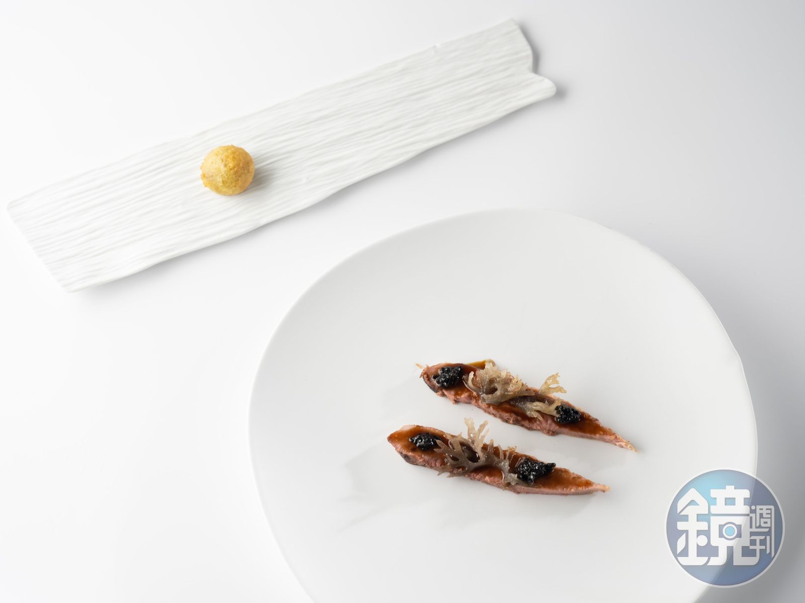 新菜之一「驕陽」,主角為龍蒿醋淹漬的玉女番茄,以鱒魚卵泥的伯那西醬融合龍蒿油,像為嚴峻的山峰染上一抹金光,也比擬著西班牙本店於群山環抱的渥達尼斯小鎮,極具線條感的面切岩石盤食器,用高溫還原燒出土中所含的自然礦物,線條宛若層疊山峰。