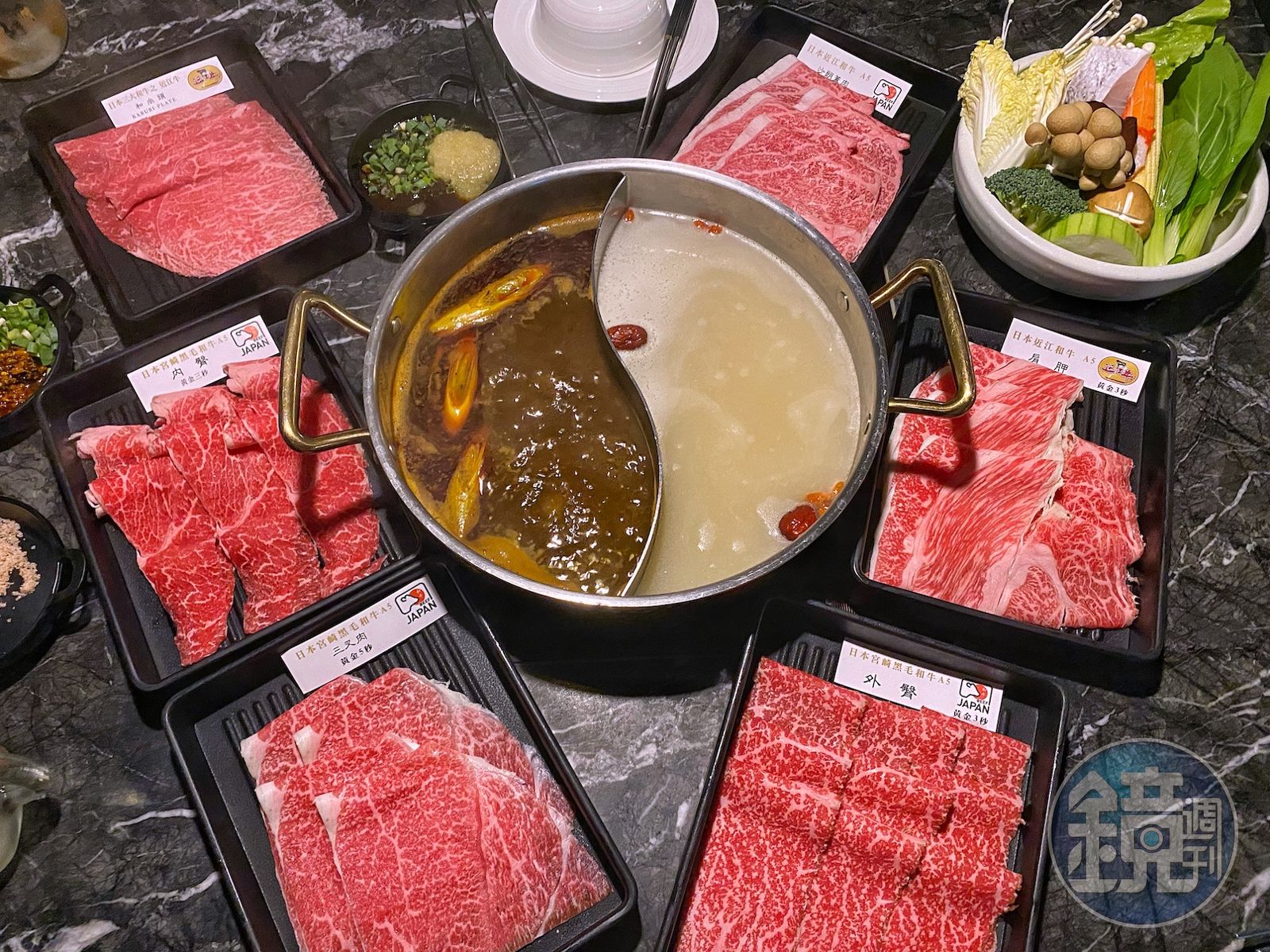 由於是涮火鍋,肉片的厚度自然沒有燒肉般厚,但油花分布仍算相當均勻細緻,內臀、外臀、和尚頭與三叉肉都是牛隻身上運動量較大的承重部位,所以油脂較少,帶點咬勁,甜度和肉味較強;肩胛有一道明顯的筋,涮完後嫩中帶Q;而沙朗蓋肉最接近一般印象中的A5和牛,油花呈現霜降狀優美,涮後入口即化,肥美無雙。