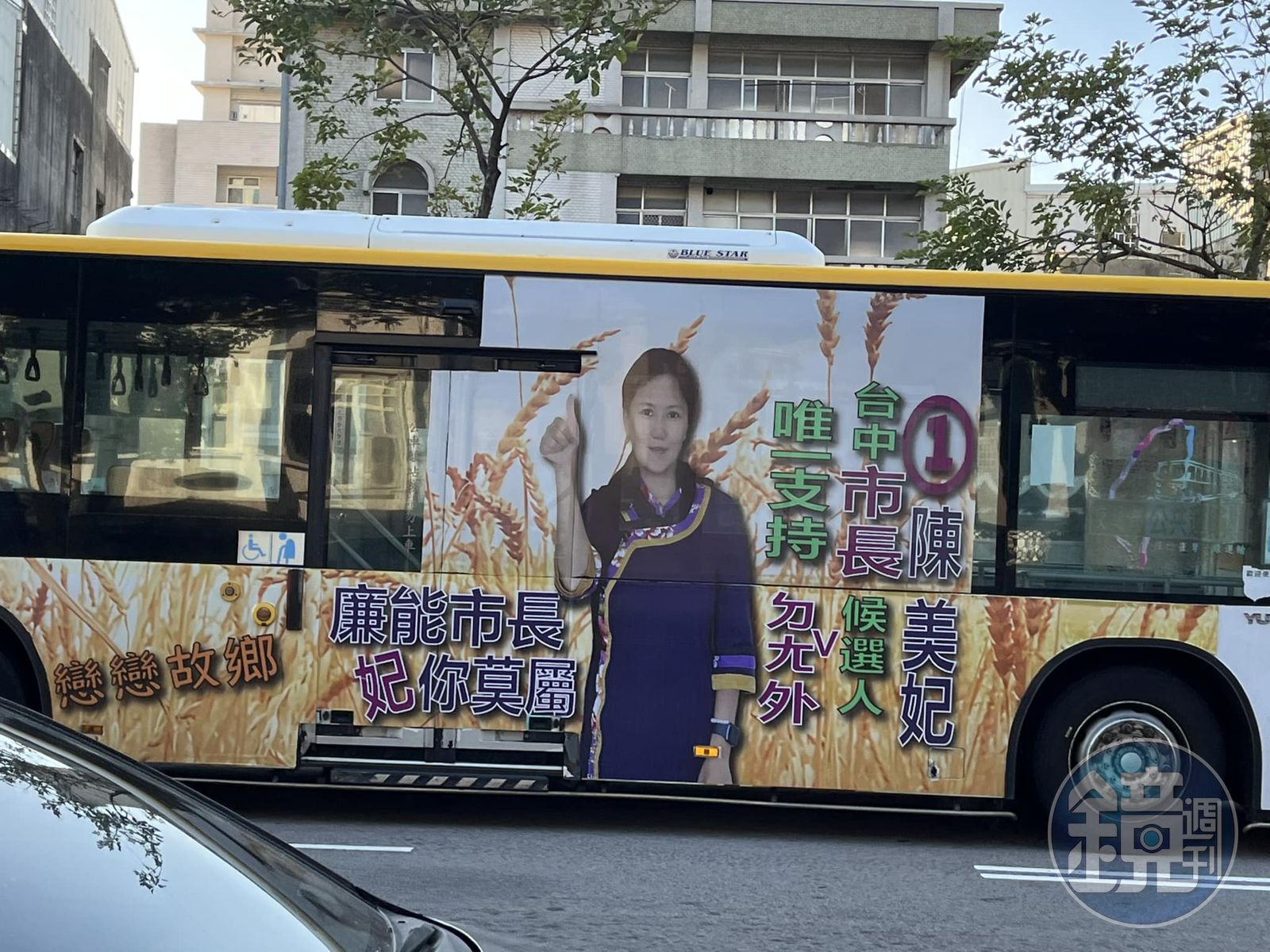 陳美妃是台中市長1號候選人,與民進黨蔡其昌、國民黨盧秀燕相比,聲勢、名氣都低落許多,甚至許多台中人都不知道除了蔡、盧以外還有其他候選人,不過這次陳美妃卻因一個貼在公車車身的廣告引發熱議。