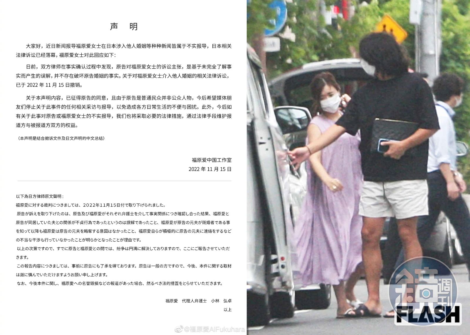 福原愛在微博發的簡體字兼日文聲明寫道「大家好,近日新聞報導福愛小姐在日本涉入他人婚姻被起訴等種種新聞皆屬於不實報導,近日日本相關法律訴訟已經落幕」、「關於福原愛小姐被訴介入他人婚姻的相關法律訴訟,原告已於2022年11月15日撤回」。