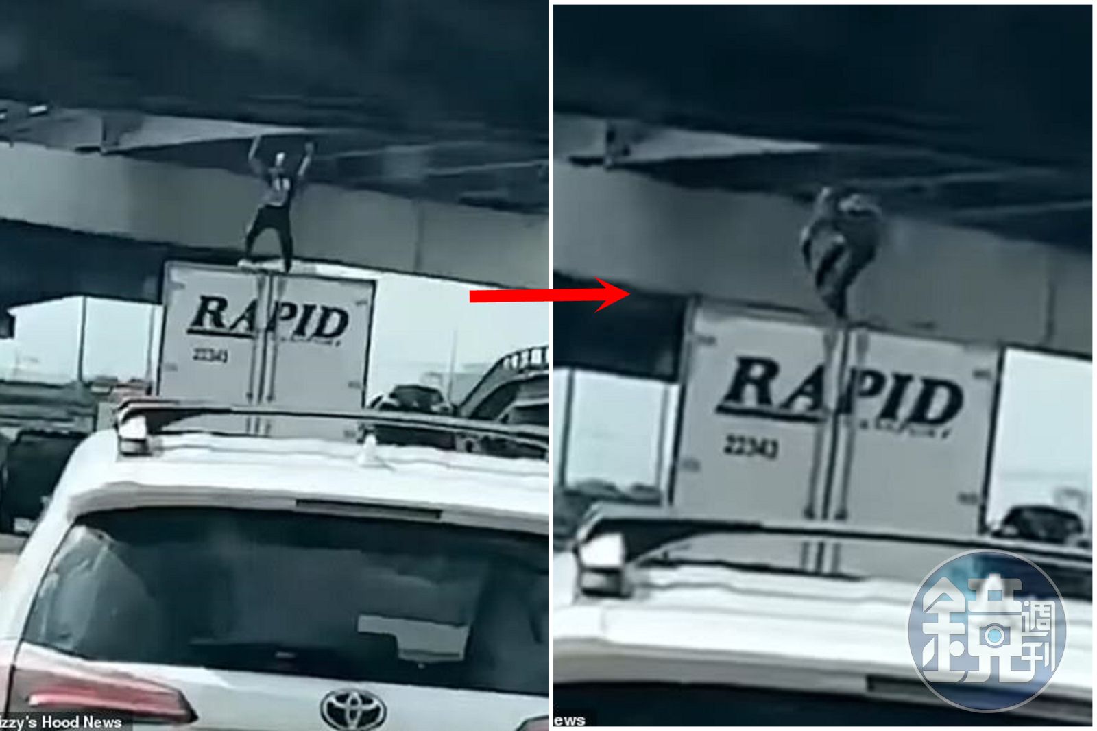 過不久,貨車行經一處高架橋底下時,男子並沒有察覺,當下頭部就直接重力撞上高架橋,男子當場爆頭,隨後身體從貨車車頂掉下來。事後據目擊者戴維斯(Crystal Davis)形容,現場可以看見一攤血水,男子跌到地面後,至少被4輛車輾壓,身體變形,脖子和手臂都斷掉。
