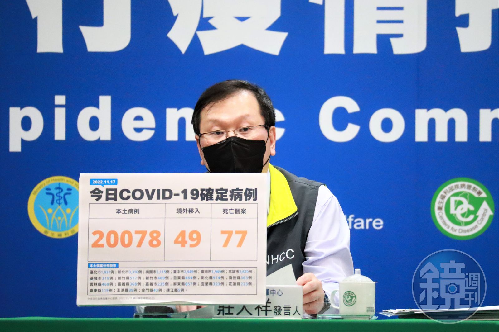 指揮中心指出,今日新增77例本土病例死亡個案,為46例男性、31例女性,年齡介於40多歲至90多歲以上,皆屬重度感染、76例具慢性病史、58例未接種3劑以上COVID-19疫苗。確診日介於10月7日至11月14日,死亡日期介於10月25日至11月14日。