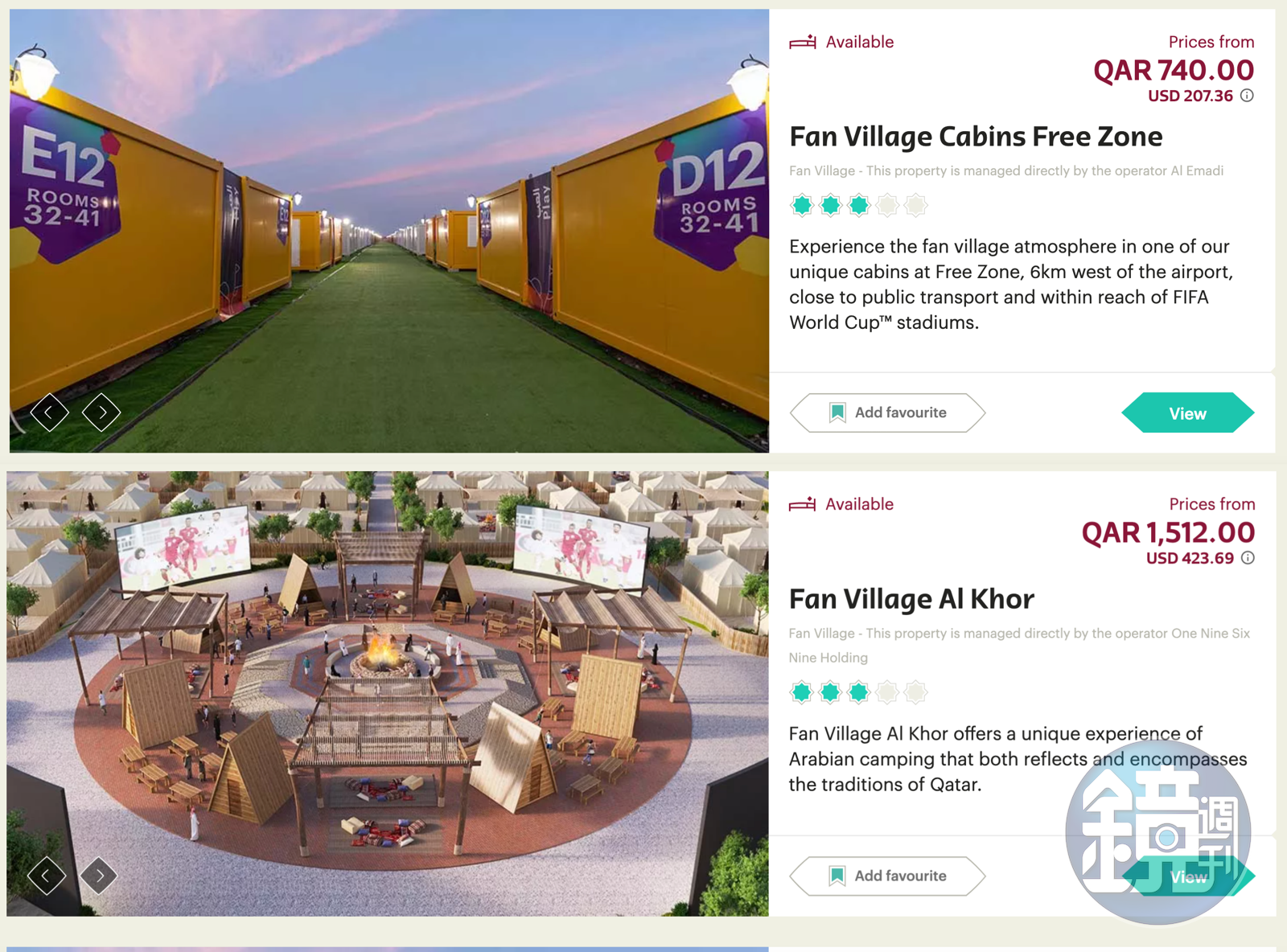 卡達世足賽提供給遊客居住的球迷村,以帳篷與貨櫃屋形式建造,其中位於機場與艾雷恩體育會附近的2區球迷村,一晚要價約207美元(約新台幣6,443元),至於位於豪爾(Al Khor)的、較豪華的球迷村,一晚則要價近424美元(約新台幣13,198元)。