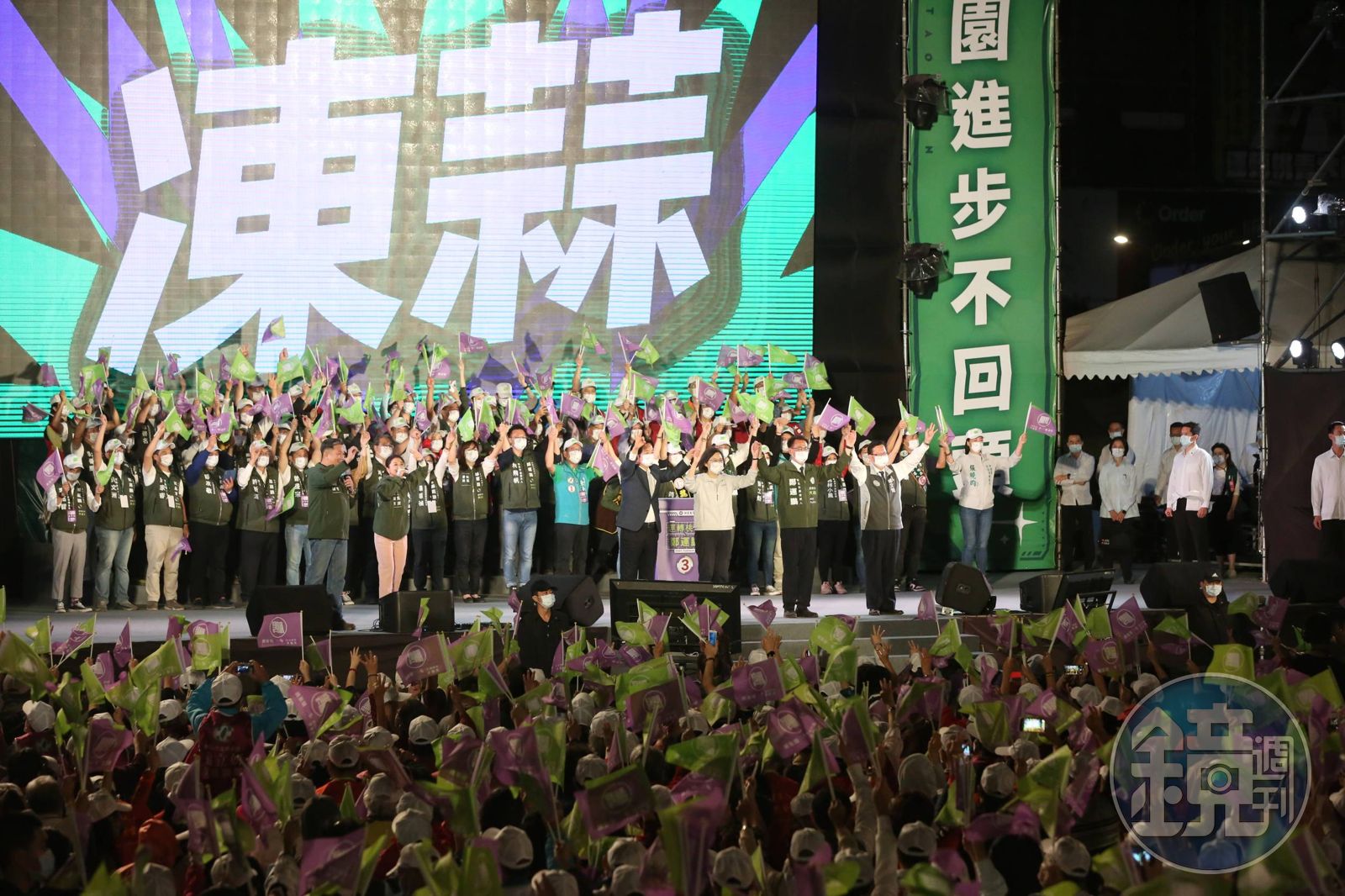 而民進黨在桃園更有不能輸的壓力,鄭運鵬昨(20日)也在中壢舉辦「延續五星光榮 黃金勝選之夜」。總統蔡英文、副總統賴清德、桃園市長鄭文燦、基隆市長林右昌、嘉義縣長翁章梁皆到場力挺,現場還湧入各大職業工會、青商團體與各類後援會等市民朋友,超過5萬人一同現身力挺。