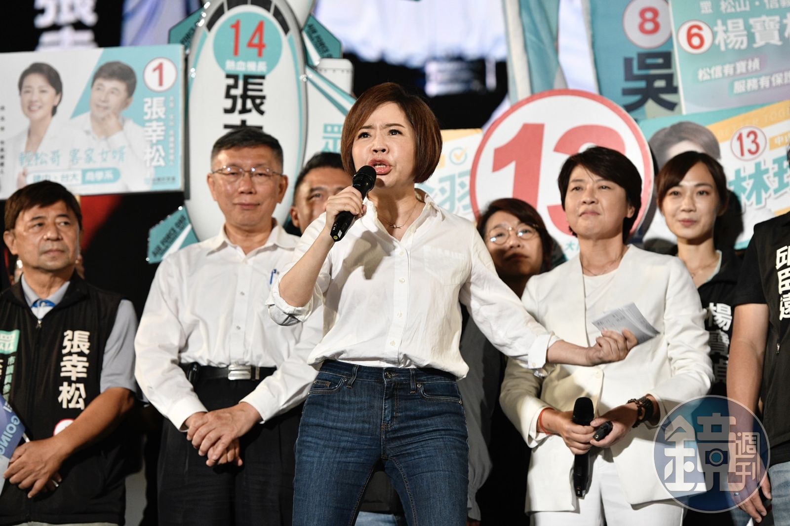 黃珊珊昨(20日)在信義區舉辦選前黃金週末的造勢活動,除了與柯文哲及民眾黨民代候選人同台,更邀來前內政部長李鴻源、前時代力量立委黃國昌站台力挺。眾人肯定黃珊珊的執政能力,砲轟藍綠製造對立,喊話讓黃珊珊入主市府,推倒藍綠的高牆。