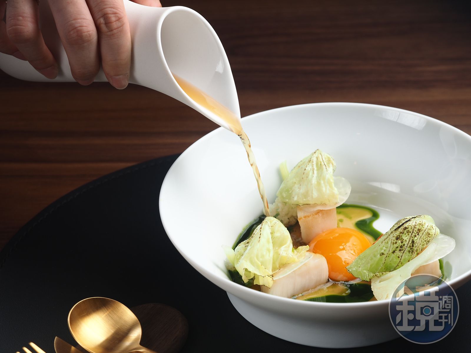 湯品「干貝」則是我認為今天嘗到最驚豔的一道,Kevin在台灣嘗到用乾貨熬的湯,於是將干貝絲、雞翅以82度慢熬12小時,再用醬油調味,點入蛋白和檸檬汁,使雜質結塊,手法有如融合了中式吊湯與法式澄清高湯。碗中放入了香煎干貝、大頭菜、抱子甘藍和油封蛋黃,吃的時候沖入碗中,胺基酸和恰到好處的鹽量,發揮了最大的鮮味加成效應,鮮味夾著蒔蘿油的木質香直擊喉頭,讓人難以忘懷。