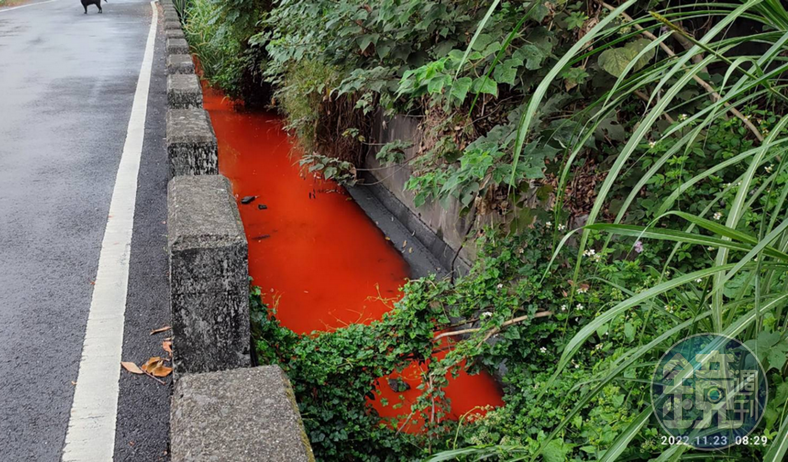 彰化縣議員曹嘉豪上午在臉書上傳幾張怵目驚心的照片,照片中可見水溝內「血流成河」,鮮紅的畫面讓附近里民感到憂慮,據曹嘉豪表示,一早8點多接到里長曹震西通報,在東北里山腳路141巷有處灌溉溝渠居然染成一面鮮紅色,向上查看發現疑似有不肖業者在偷排汙水,緊急通報環保局到現場稽查。