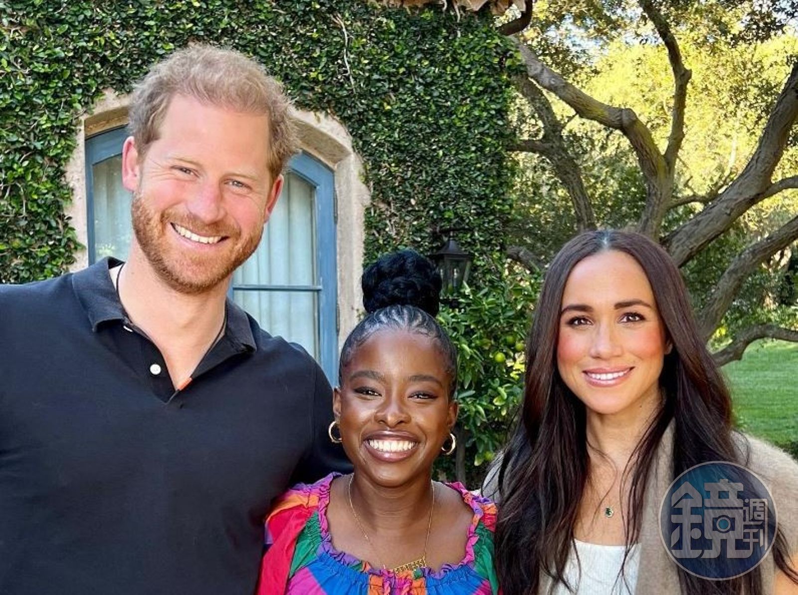 詩人戈爾曼週三(23日)在IG貼出與哈利、梅根的合照,她以梅根的頭銜「薩塞克斯公爵夫人」尊稱她說:「非常榮幸能在公爵夫人的Podcast節目《Archetypes》中與她交談,我們討論了女性做為改革者所擁有的力量。非常感謝您邀請我!」