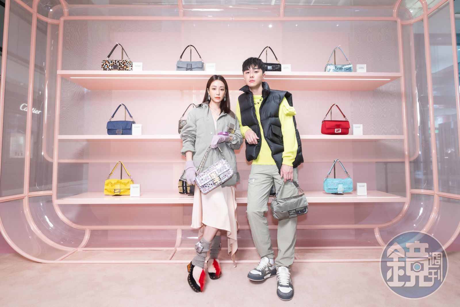 謝欣穎身穿V領緞面洋裝NT$138,000、擴型夾克NT$152,000、Baguette造型手套NT$19,800、Baguette造型長襪NT$23,500、水貂毛木屐低跟鞋NT$75,000、鏡面設計Baguette NT$198,000。(FENDI提供)施柏宇身上的Baguette造型針織衫NT$38,000、Baguette造型羽絨背心NT$71,000、尼龍材質長褲 NT$38,500、FENDI x PORTER聯名尼龍Baguette NT$102,000。(FENDI提供)以Baguette 25週年為主題的FENDI新光三越台南新天地Pop up快閃店,展出眾多Baguette包款,謝欣穎認真聽每個包款的講解後說:「覺得每個包款都有它的意義在,而且有延續過去設計的特色,我在知道材質與作法之後,每個都很喜歡。」她表示最喜歡今日穿搭單品中的Baguette造型長襪,上面的小包包「可以放零錢」。