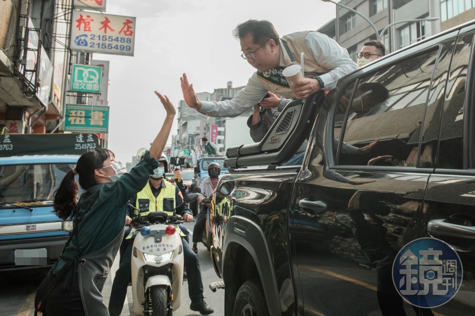 黃偉哲昨日下午發布3張掃街拜票照片,第一張是綁著馬尾、穿飲料店制服的女店員站在街邊,手裡拿著珍奶望向黃偉哲的車隊;第二張可以看到飲料已順利交給黃偉哲,黃偉哲還在車上與店員擊掌;第三張則是黃偉哲右手比讚、左手拿珍奶準備享用。黃偉哲在貼文寫下,「謝謝妳,奶茶妹妹!車掃很辛苦,但有這杯全糖珍奶,就是最美好的祝福」。