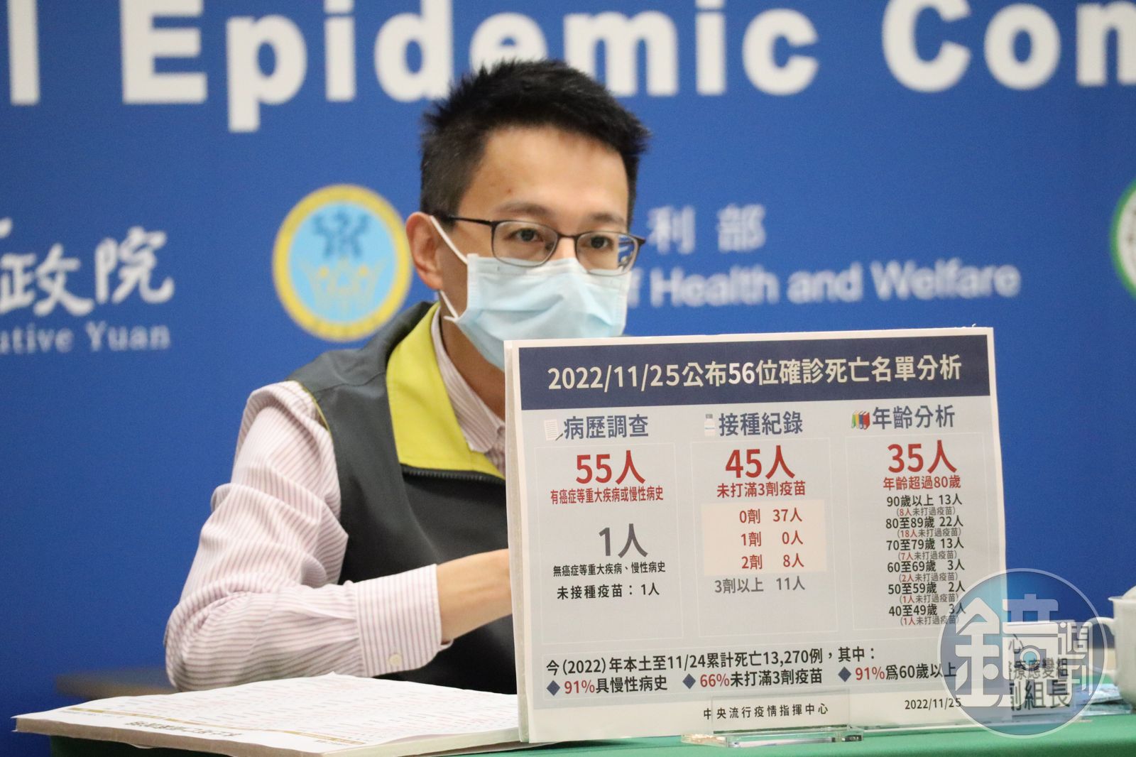 醫療應變組副組長羅一鈞指出,死亡個案最年輕為3名40多歲案例,第一位40多歲男性,本身有慢性神經系統疾病,長期臥床使用呼吸器的個案,11/1出現呼吸困難跟咳嗽症狀,當天急診就醫PCR陽性確診,因肺炎住院治療,不幸因合併呼吸衰竭於11/3死亡,死因為新冠肺炎合併呼吸衰竭,有接種過4劑疫苗。