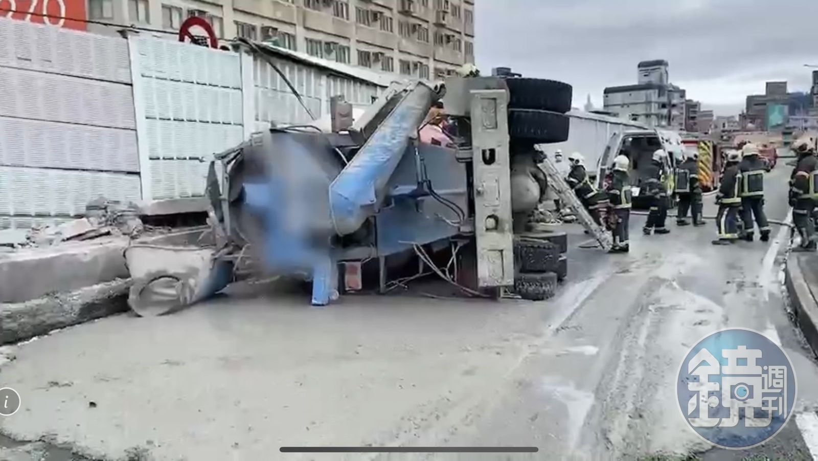 警消指出,年約54歲的水泥預拌混凝土車駕駛,今早沿水源快速道路往新店方向行駛,但因自撞翻覆,造成駕駛受困車內,救出後送往台大醫院治療,無生命危險。 轄區警方獲報後前往處理,該路段因這起意外造成車流回堵,警方立即協助交通指揮。因預拌車撞擊力猛烈,撞毀隔音牆及護欄,差一點車子就墜落到平面道路,也導致現場滿布隔音牆碎片,警方也立即通報相關單位及吊車到場協助,直到下午約2點30分左右,該路段事故才排除。
