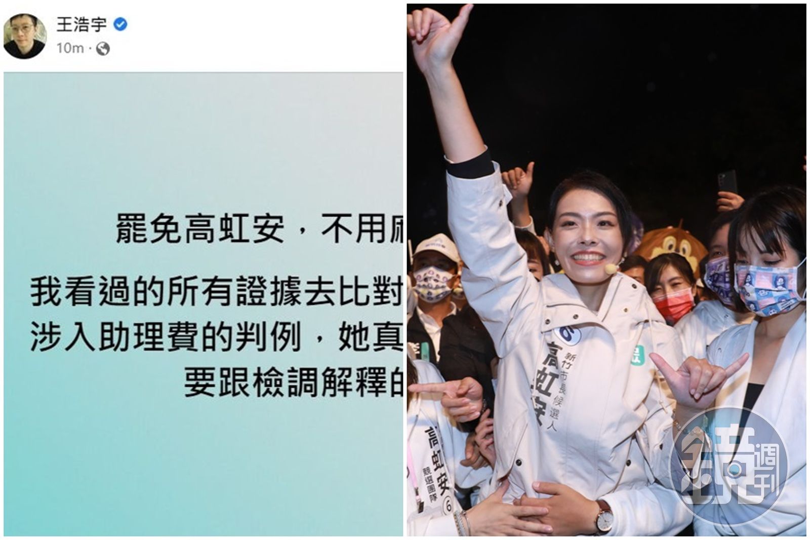 被罷免下台的民進黨前桃園市議員王浩宇,向來敢說敢言,今再度於臉書發表大選相關議題,在臉書發文表示「罷免高虹安,不用麻煩了」,並自稱看過的所有證據且去比對之前議員同事涉入助理費的判例,直言「她(高虹安)真的有不少事情要跟檢調解釋的」,一番言論話中有話,似乎暗示不必發動罷免就有機會讓高虹安下台。
