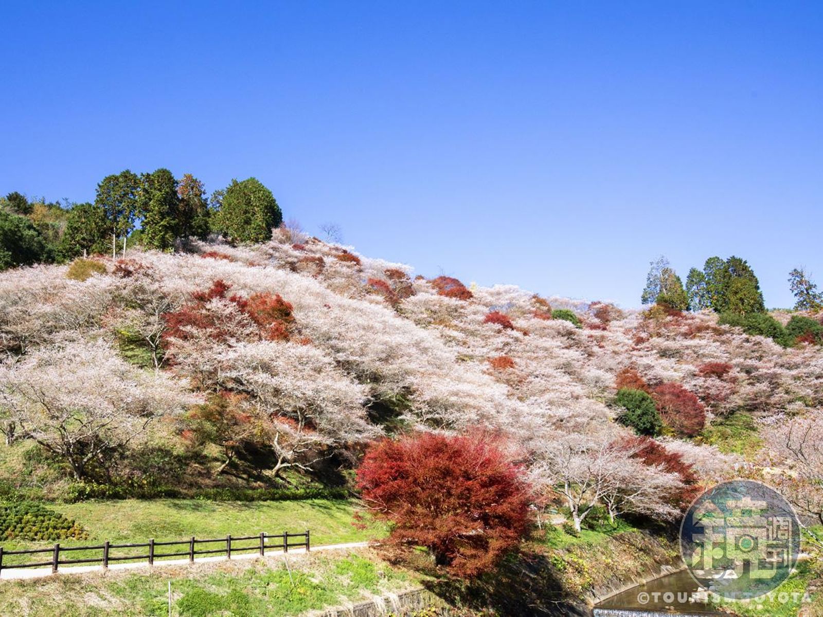 愛知縣豐田市的小原地區還種植著約10,000株的四季櫻,有別於一般櫻花品種只在春季滿開,小原的四季櫻一年開花兩次,是日本少有、能同時欣賞楓葉與櫻花盛開雙重美景的地方。「川見四季櫻之鄉」是小原四季櫻種植最密集的地點,漫山遍野的粉色四季櫻,以及點綴其中的豔麗楓紅,美得令人屏息。