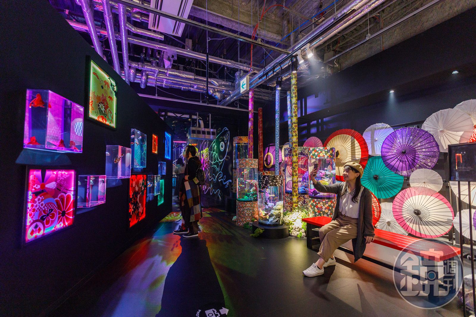 第二區「花魁」則以透過背景色彩鮮豔的紙傘、華麗的水族箱造景,成為館內最好拍攝的角落。而牆面上水族箱也搭配充滿和風的色紙,讓觀賞者以不同以往的方式欣賞各種金魚。