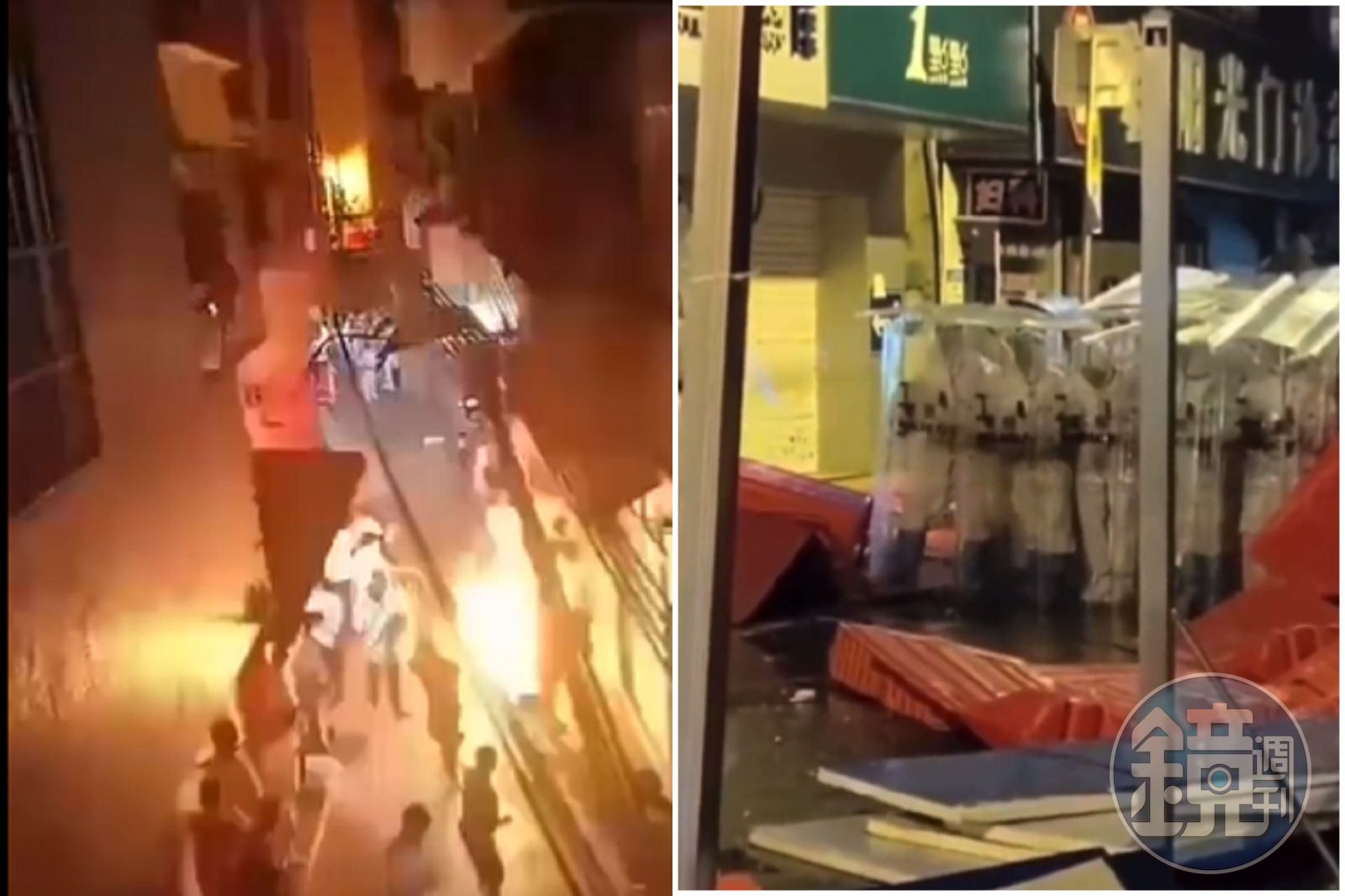 從網友傳出的影片可見,眾多警力穿上防護衣變成「大白」,圍起人牆,並對抗議民眾直接丟擲瓦斯汽油彈,影片可見丟擲當下冒出火光與白煙,讓抗議群眾嚇到後退、逃跑。但部分抗議民眾並不想就此屈服,於是拿出酒瓶與警方對槓,現場狀況宛如變成「廣州起義」的畫面。不過影片也錄下,最後「大白警力」逮捕多名民眾。