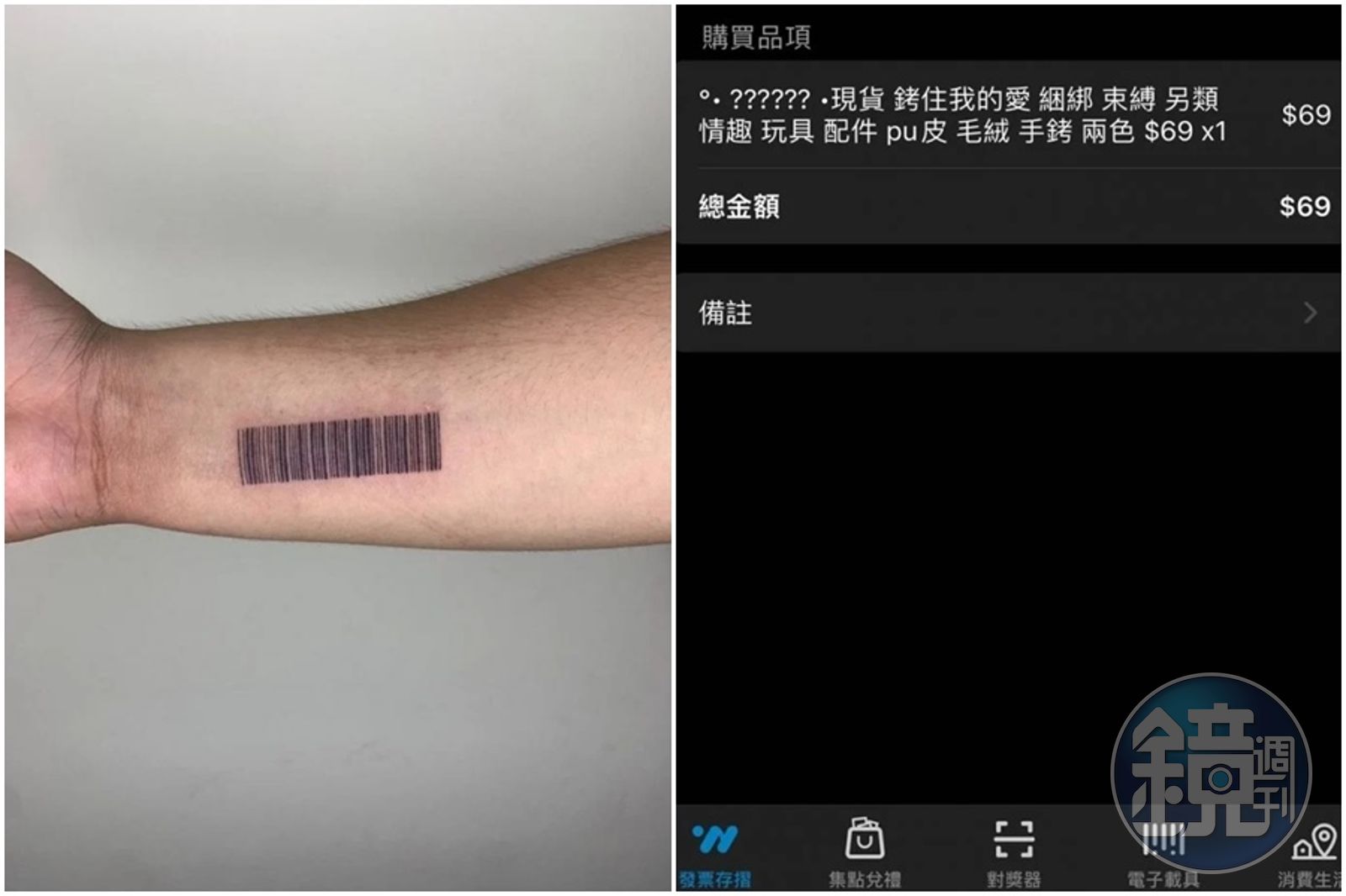 該名網友日前在論壇Dcard刺青板發文表示,一直想刺一些與眾不同的刺青,後來想到每次結帳要開手機出示載具好麻煩,不如直接刺在身上,最後刺完實測,在超商和加油站請店員直接掃刺青的條碼,都能順利讀取。 這名網友昨(29日)又在Dcard心情板發文,「是誰偷刷我載具啦靠北,是誰買情趣用品刷我的載具啦!」原PO秀出電子發票明細的截圖,其中一筆在遠東百貨消費5千多元,另外還有一筆情趣用品69元,他傻眼表示「中了我真的會私藏欸…」。 網友看了紛紛笑翻,「買情趣用品的很明顯是陷害吧~」 「到底誰那麼無聊快笑死」 「好好笑,繼續留著貼文,中千萬的機會增加,每個人買東西都幫你刷條碼」 「超白癡哈哈,原本想說被盜刷感覺很危險,才想到是載具根本沒事,中獎機率提高了」 「好,謝謝你載具人,我記起來了,下次買怪怪的東西就刷你載具,男友就看不到了」 「我要笑死,別人國民老婆、國民妹妹,你是國民載具,好讚喔⋯」 「我真的會笑瘋欸,而且情趣用品的價格還是69會不會太剛好」 。