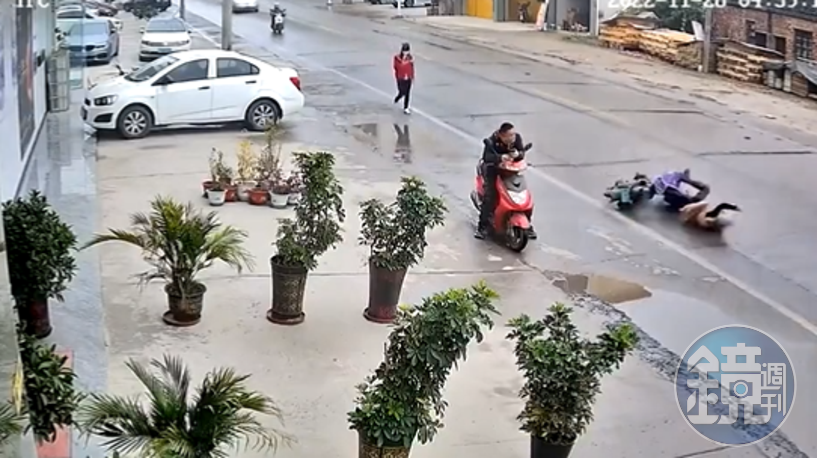 從中國網友轉傳的影片可見,事發在11月28日,一名女騎士行經一處大馬路,由於當地剛下過一陣雨,這名女騎士不慎打滑,隨後整個人重摔在地。女騎士倒在地上後,雙手顫抖,忍著痛楚向旁人求救。