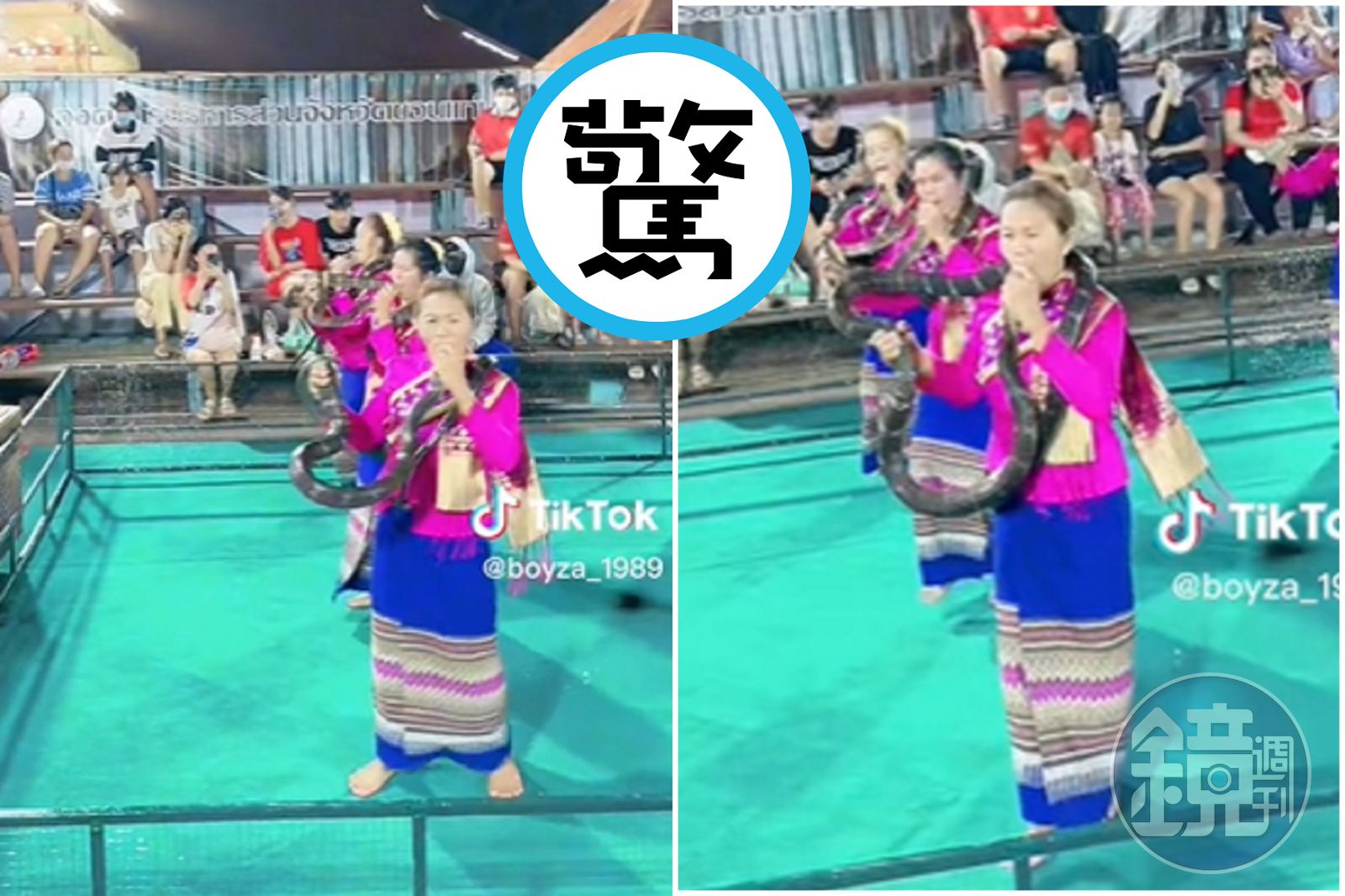 近日TikTok上流傳一段影片,影片可見一群大媽參加當地一場慶典活動,這群大媽團隨著音樂跳舞,但脖子掛著一條又粗又長的東西,更直接「含頭」。仔細一看,大媽身上掛著的都是具有毒性的眼鏡王蛇,但這群大媽毫無畏懼,不僅帶著眼鏡王蛇跳舞,還不時把蛇頭放進口中,大玩「喇蛇頭」表演。