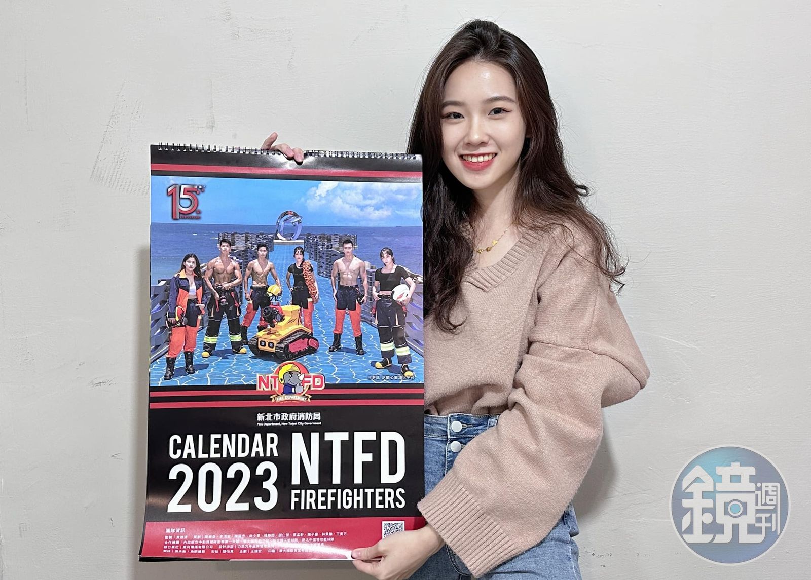 陳紫渝今天於臉書po出一張手拿「2023新北消防形象月曆」的照片,並留言直呼「救火英雄也熱心於公益活動」,該張照片曝光也讓她與月曆封面上3位救火猛男另類「合體」。
