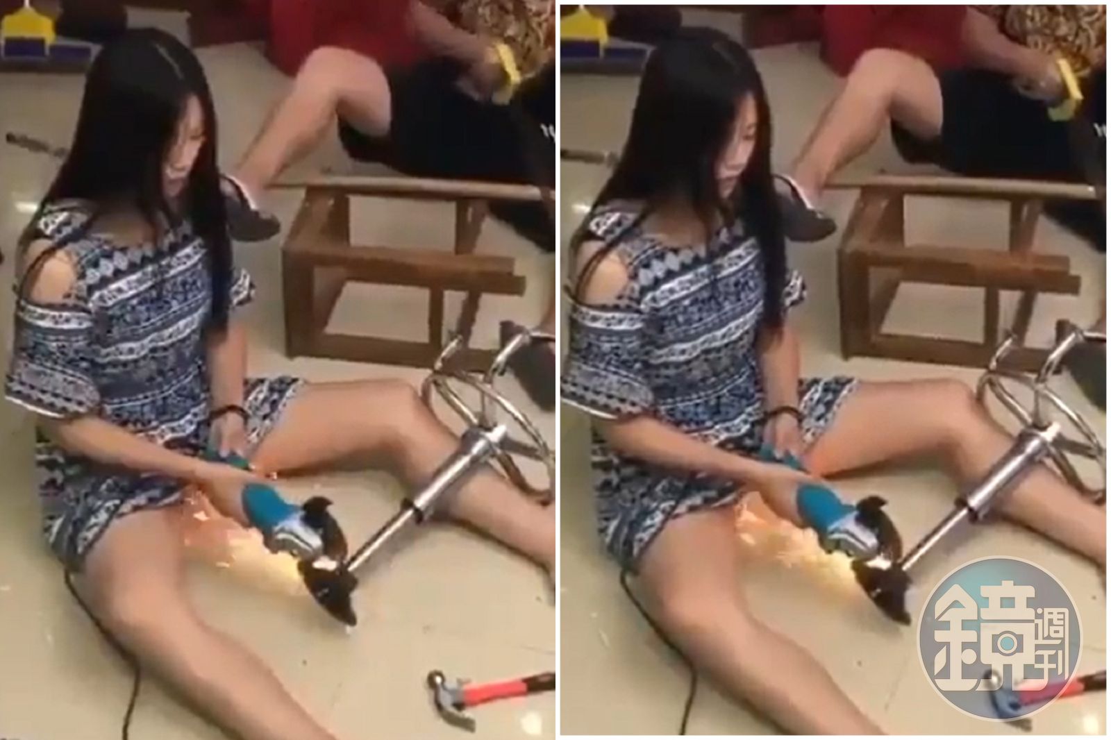 影片可見一名正妹與另一名男子,在家中進行工業技術,男子在旁切割長條物,正妹則是負責打磨鐵椅的一部分。不過正妹的穿著相當優雅性感,完全沒有安全配備,隨後正妹就使用打磨機,打磨鐵椅的連接部分。