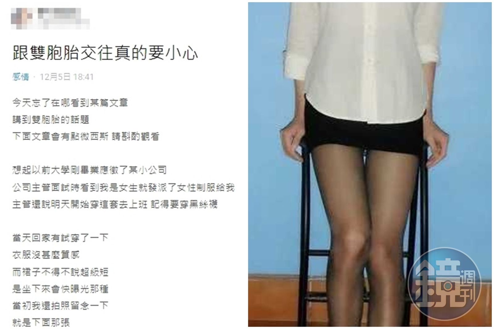 一名女網友在Dcard以「跟雙胞胎交往真的要小心」為題發文,表示自己大學剛畢業應徵上某間小公司,當時公司發了一件沒質感的制服,其中還有一件超級短的裙子,原PO也貼出當時留念的照片,「是不是很短…感覺裙子長度只有30幾公分」,並在上班後發現公司規模小「加上我、主管、老闆,只有7個人,男生5個」。