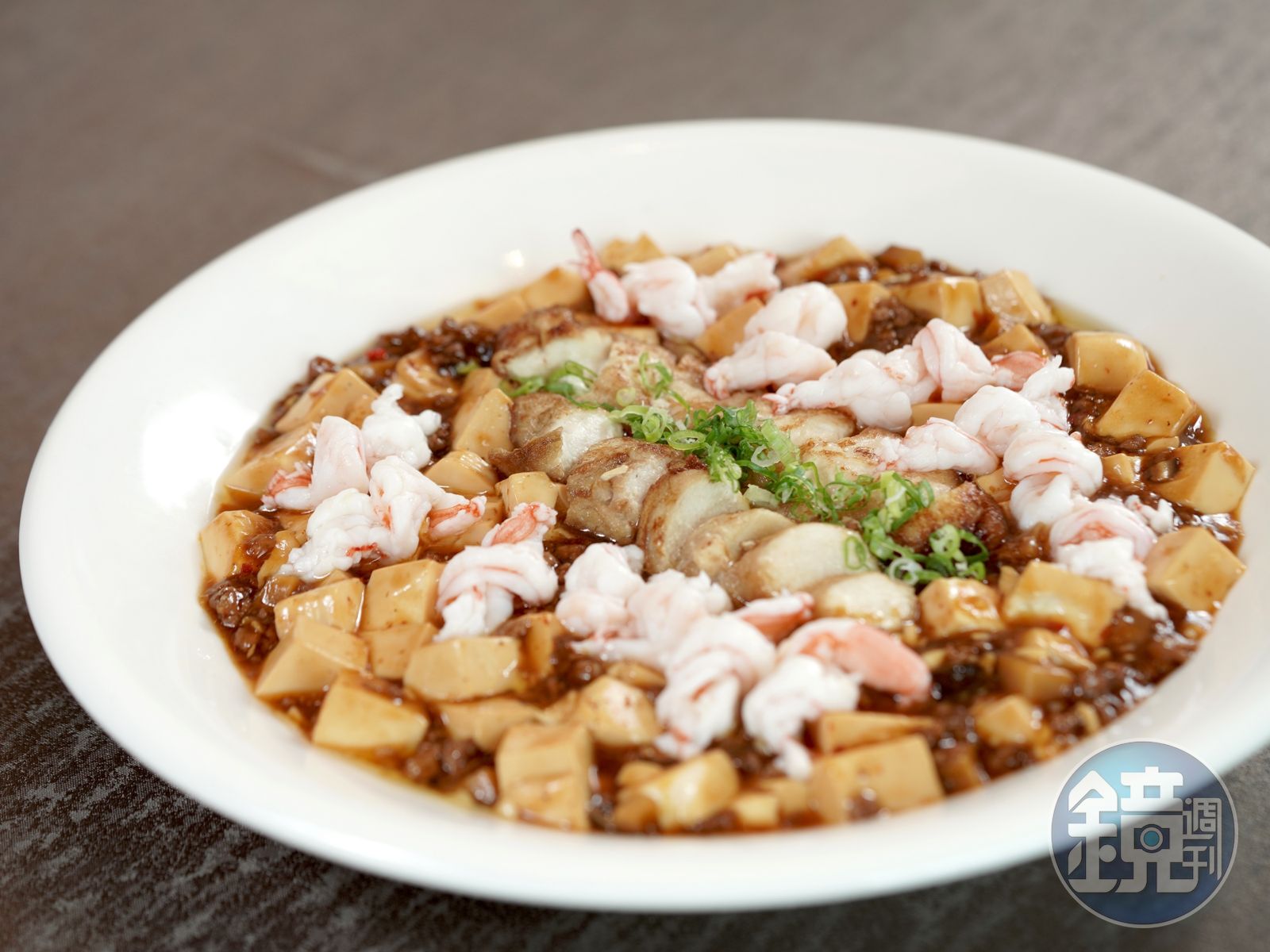 「和牛白子活蝦麻婆豆腐」用了和牛、白子,變化出麻婆豆腐的天花板!豬絞肉改為和牛絞肉,加入香煎後的白子、鮮蝦,鮮上加鮮,香氣華麗,十足下飯。「蔥油淋魚」及「花雕蒸蛋白」是鮮味化身,去骨去刺的老虎斑,肉Q鮮美,氣孔細膩的蒸蛋有了花雕酒、瑤柱加持,鹹鮮滑口。