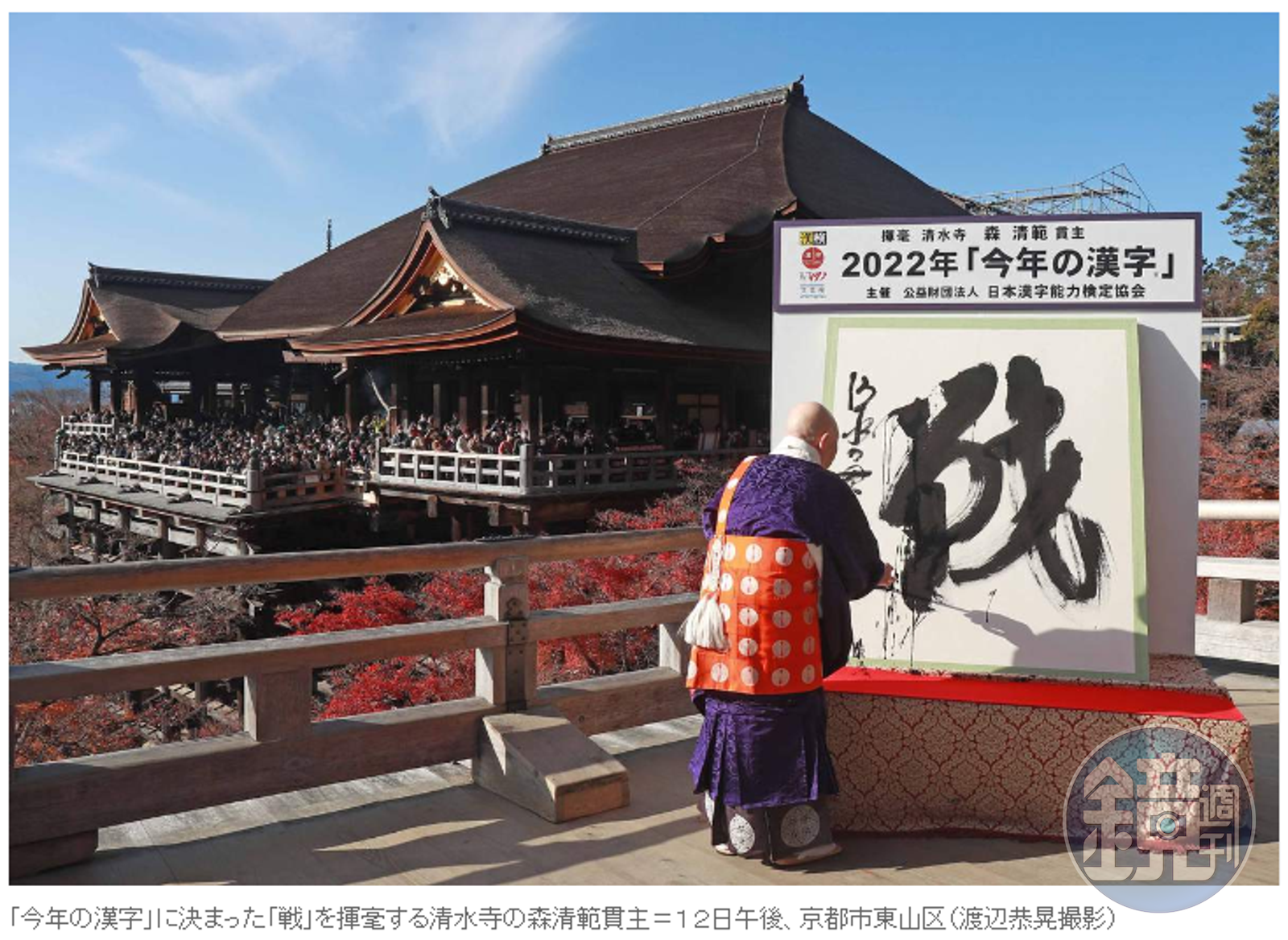 今日當地時間下午2時由清水寺貫主森清範,大筆揮毫「戰」字。大會指出,由於今年發生俄羅斯強勢進攻烏克蘭,以及日本民眾面對高物價之苦,還有北韓頻頻射飛彈侵擾日本海,加上今年日本隊在世足賽的表現不差,因此讓不少民眾選擇「戰」為代表字。據悉在2001年發生美國911恐攻事件時,當時日本民眾也選擇「戰」為年度代表字。