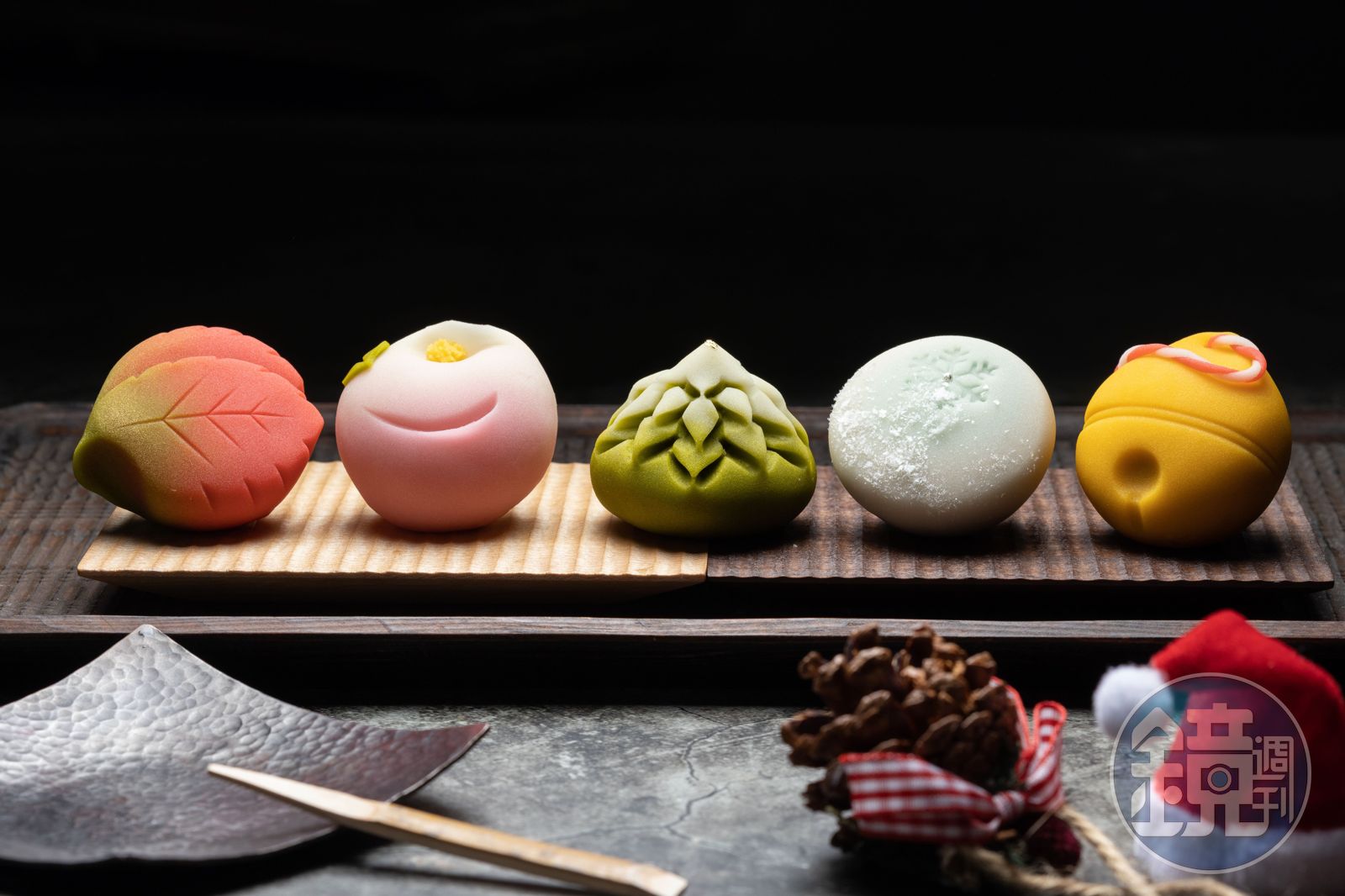 因此每月1日推出的季節禮盒,常常開賣當日就完售,好比這次耶誕禮盒「聖夜」,5顆練切和菓子,有聖誕紅、聖誕樹、神鈴、雪花與寒椿造型,近看立體的聖誕樹採「箸切」切出葉緣,黃色神鈴上有紅白纏繞的細線,非常可愛,難怪一開賣15分鐘售罄。