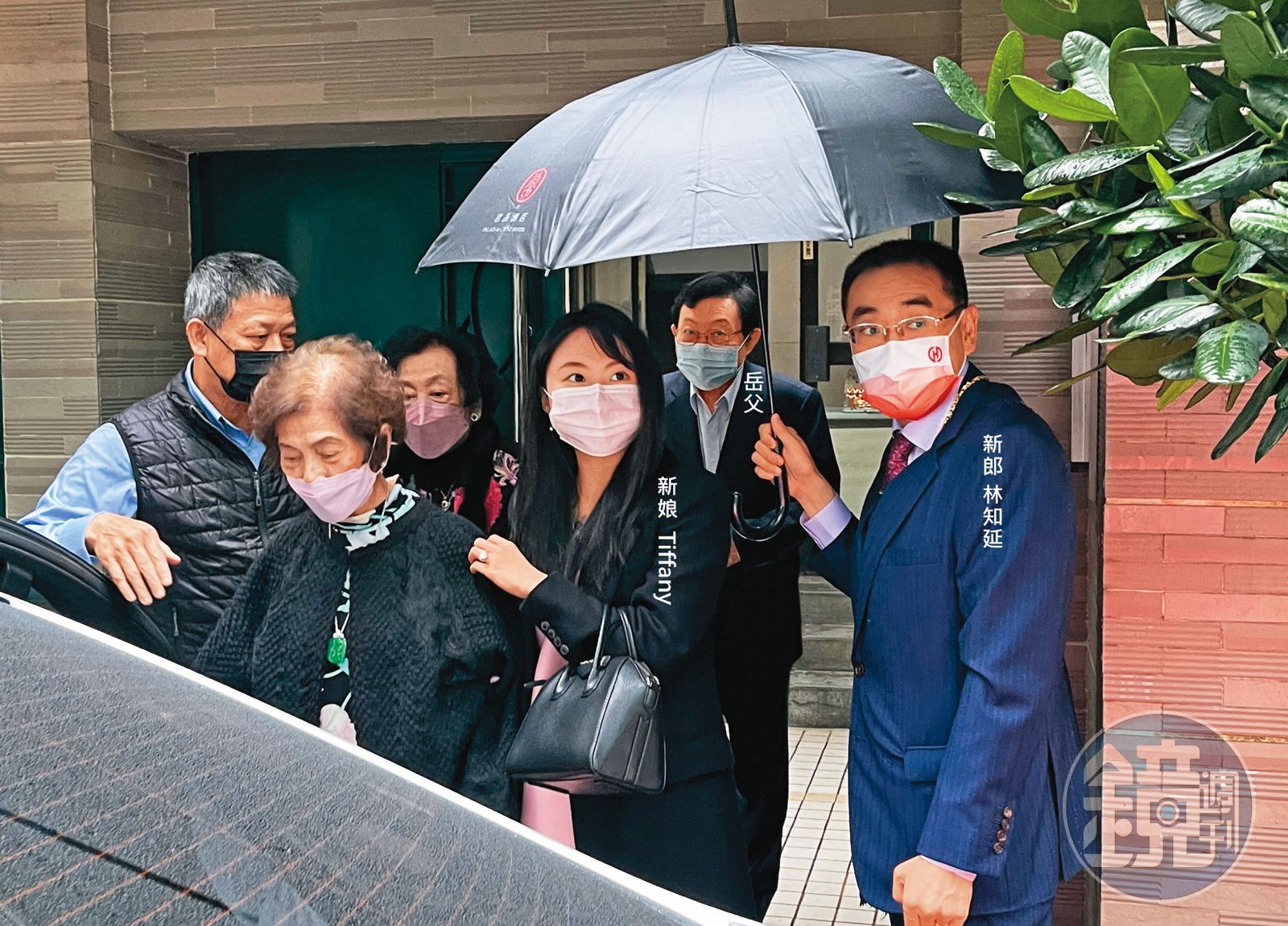 雖然林家並未公告周知,但迎娶當晚林家仍有一場溫馨的家宴,近午時分,林知延的二弟林知蔚率先搭著賓士電動車回家,他身著綠色長衣,搭配白色長褲,一手緊抓iPhone手機,另一手扶著藍白相間的側包,神似緊張,下車後快步進家門。