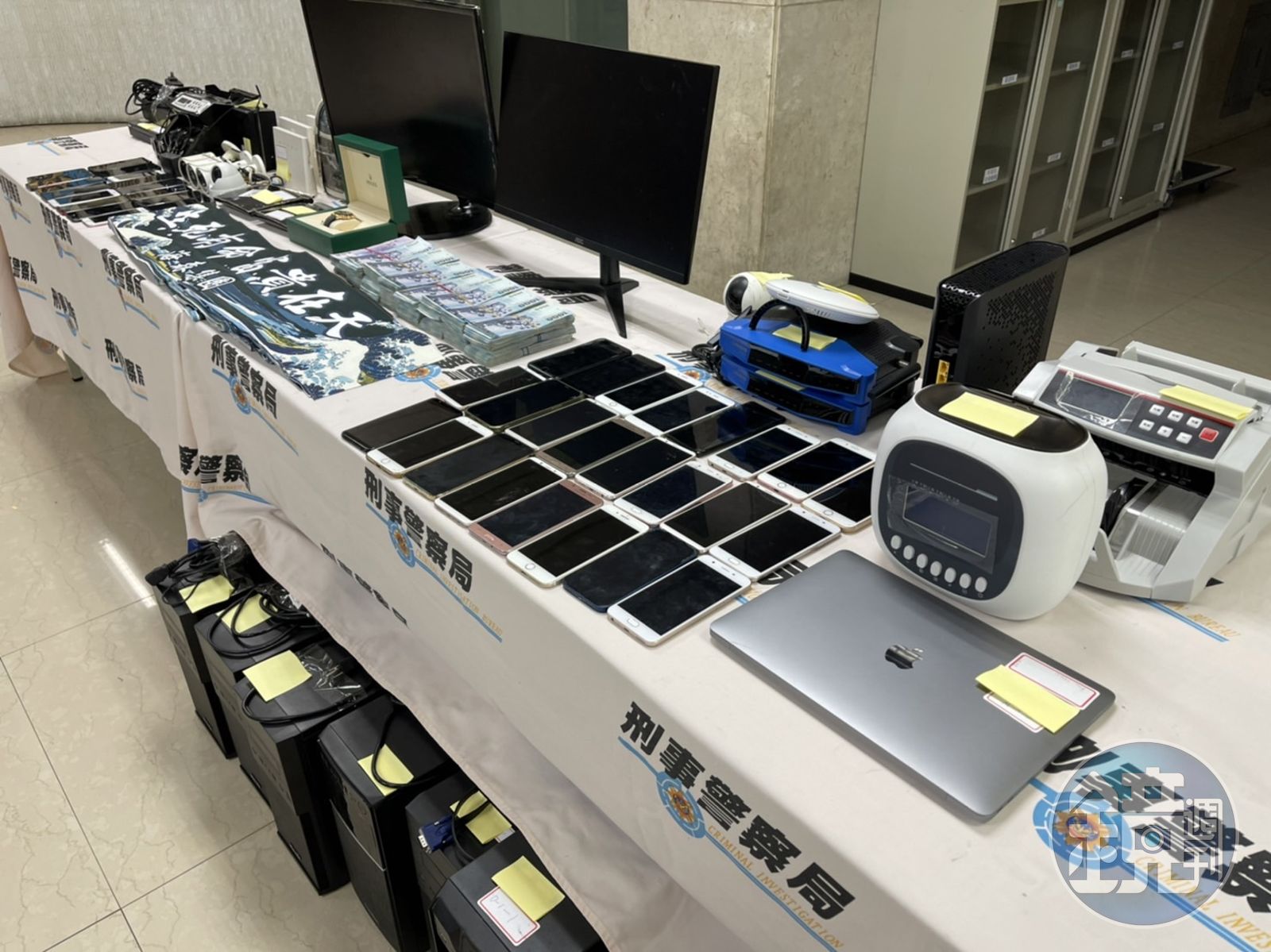 刑事局偵二大隊11月在新北市三重、新莊等地,逮捕以陳男(36歲)為首的詐騙集團成員共15人,起出犯罪用手機、電腦主機、WIFI分享器、四海幫信物毛巾,不法所得現金233萬、勞力士手錶2支(市值約180萬元)、金飾、轎車等贓證物,總價值約583萬餘元。