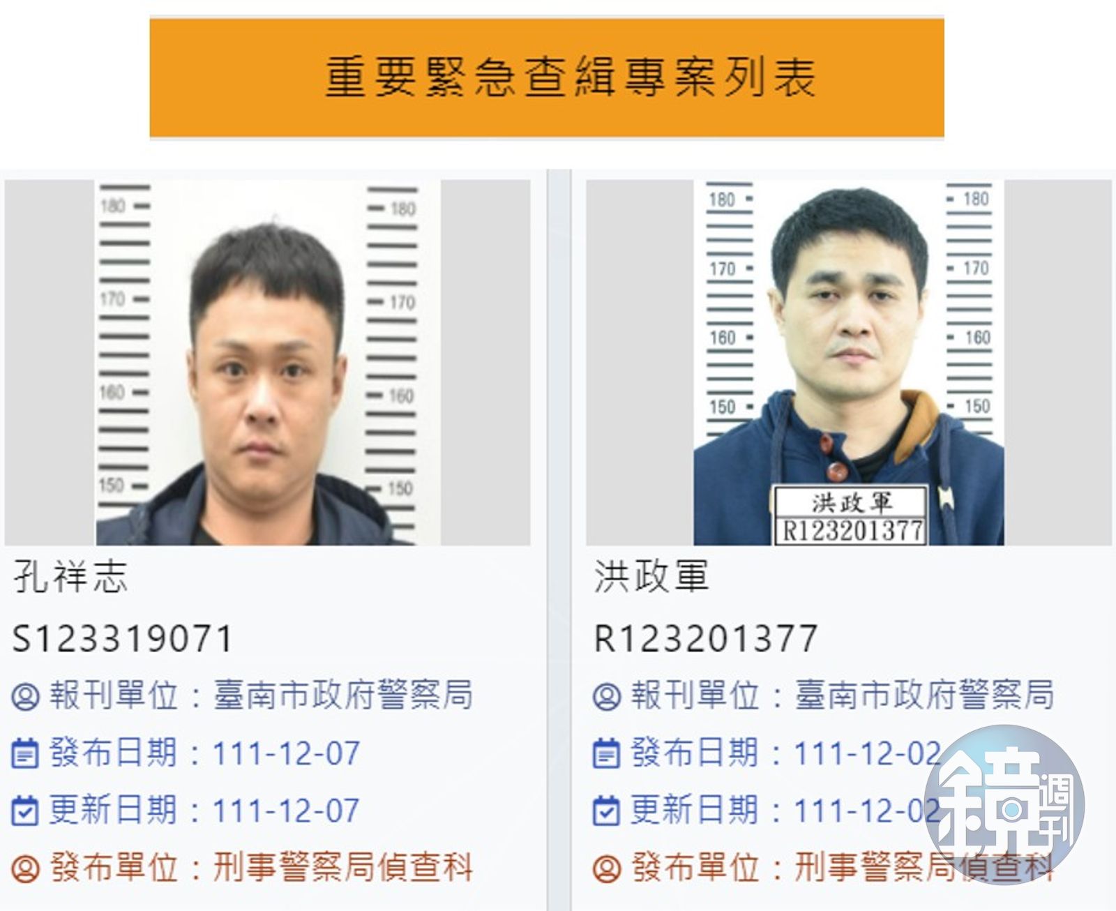 警政署發布通緝專刊全力緝捕涉及重大槍擊案的洪政軍、孔祥志。(警政署提供)發布時間:2022.12.16 10:22 臺北時間